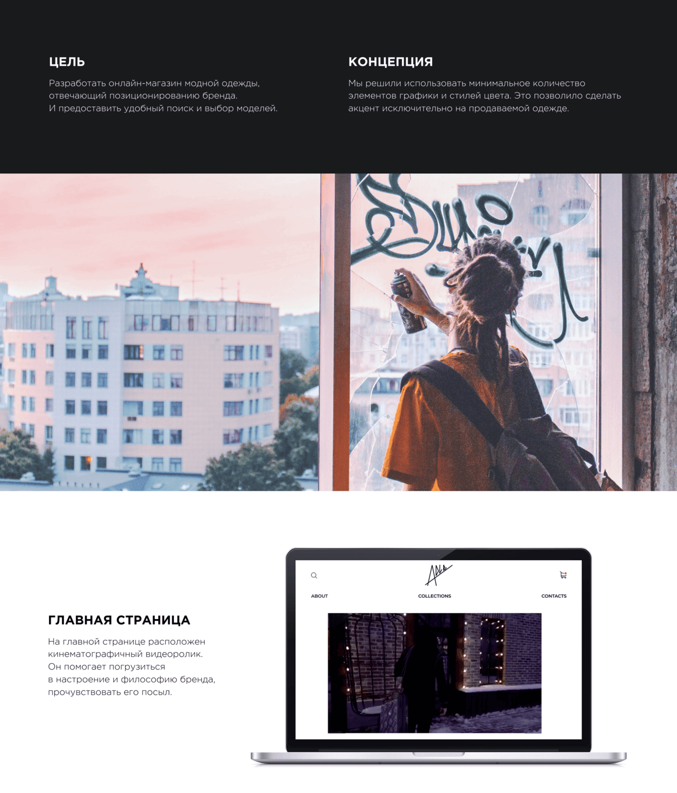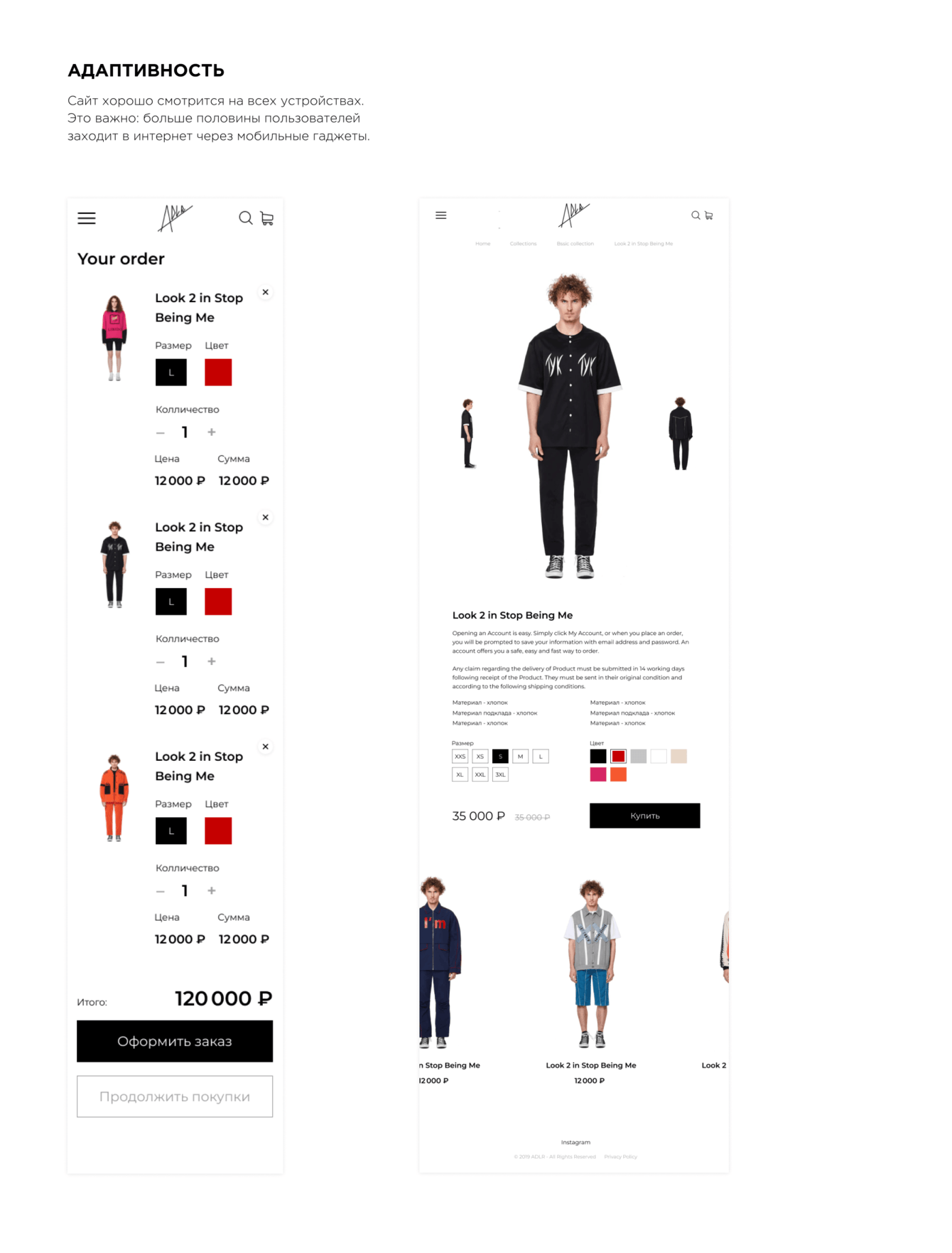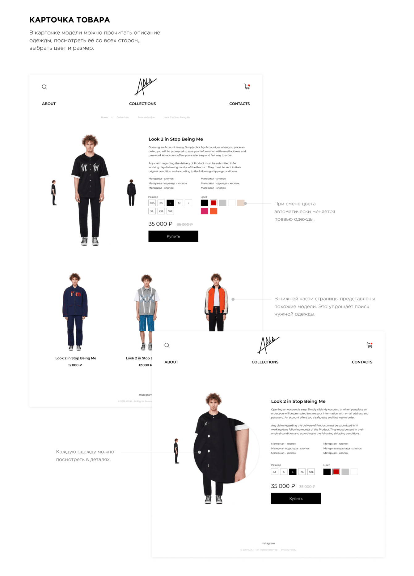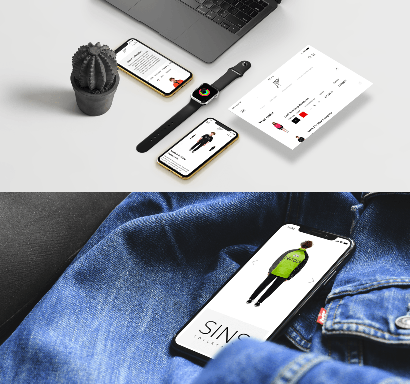 Мы решили использовать минимальное количество элементов графики и стилей цвета. Это позволило сделать акцент исключительно на продаваемой одежде.