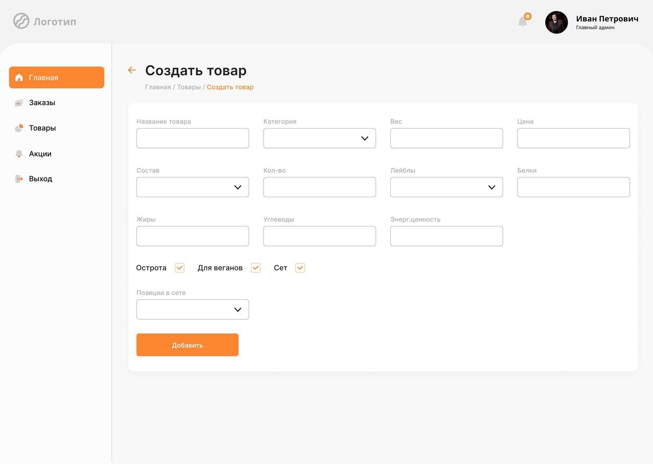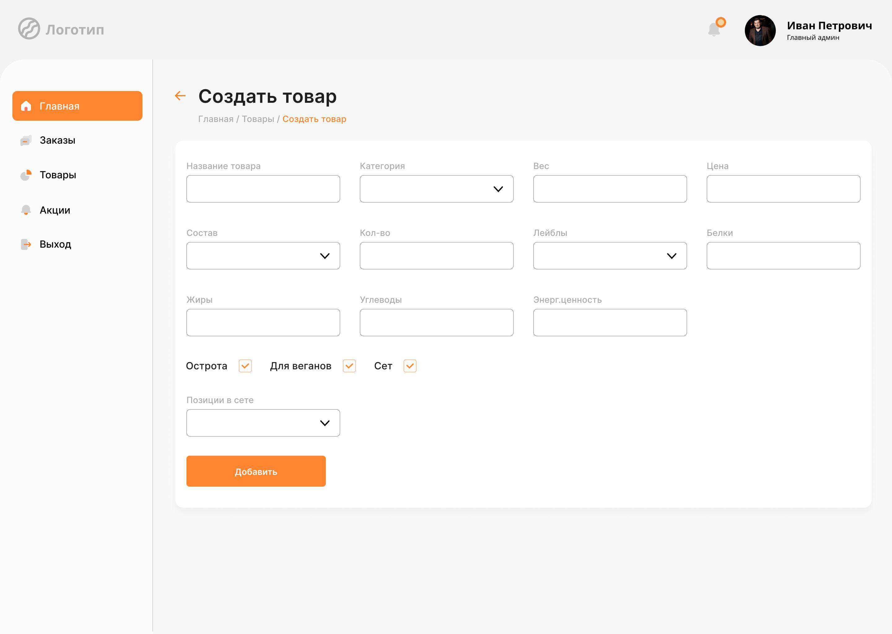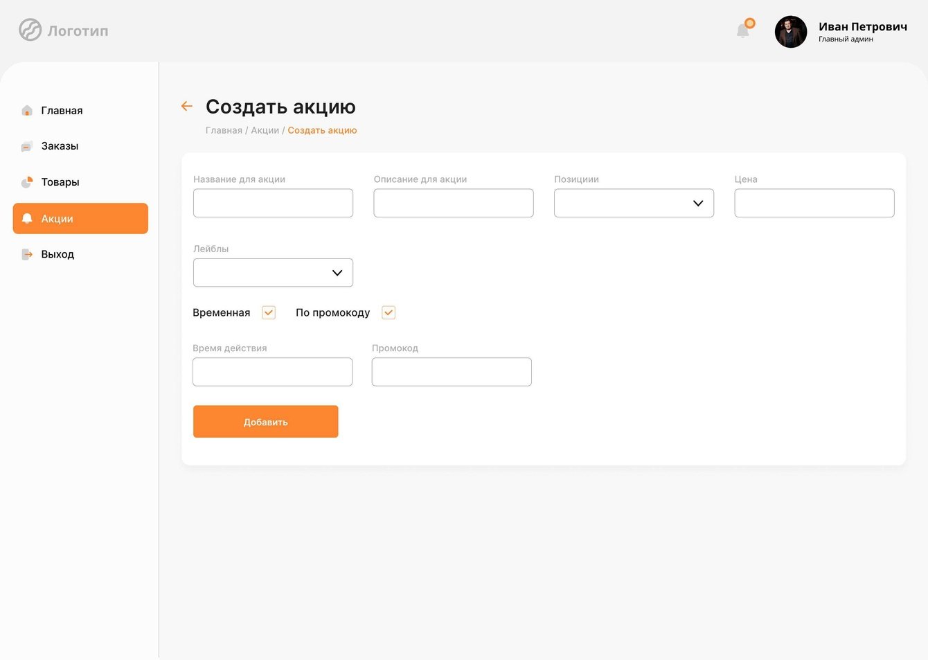 • Главное меню с навигацией по основным разделам (главная, товары, акции, заказы, выход)