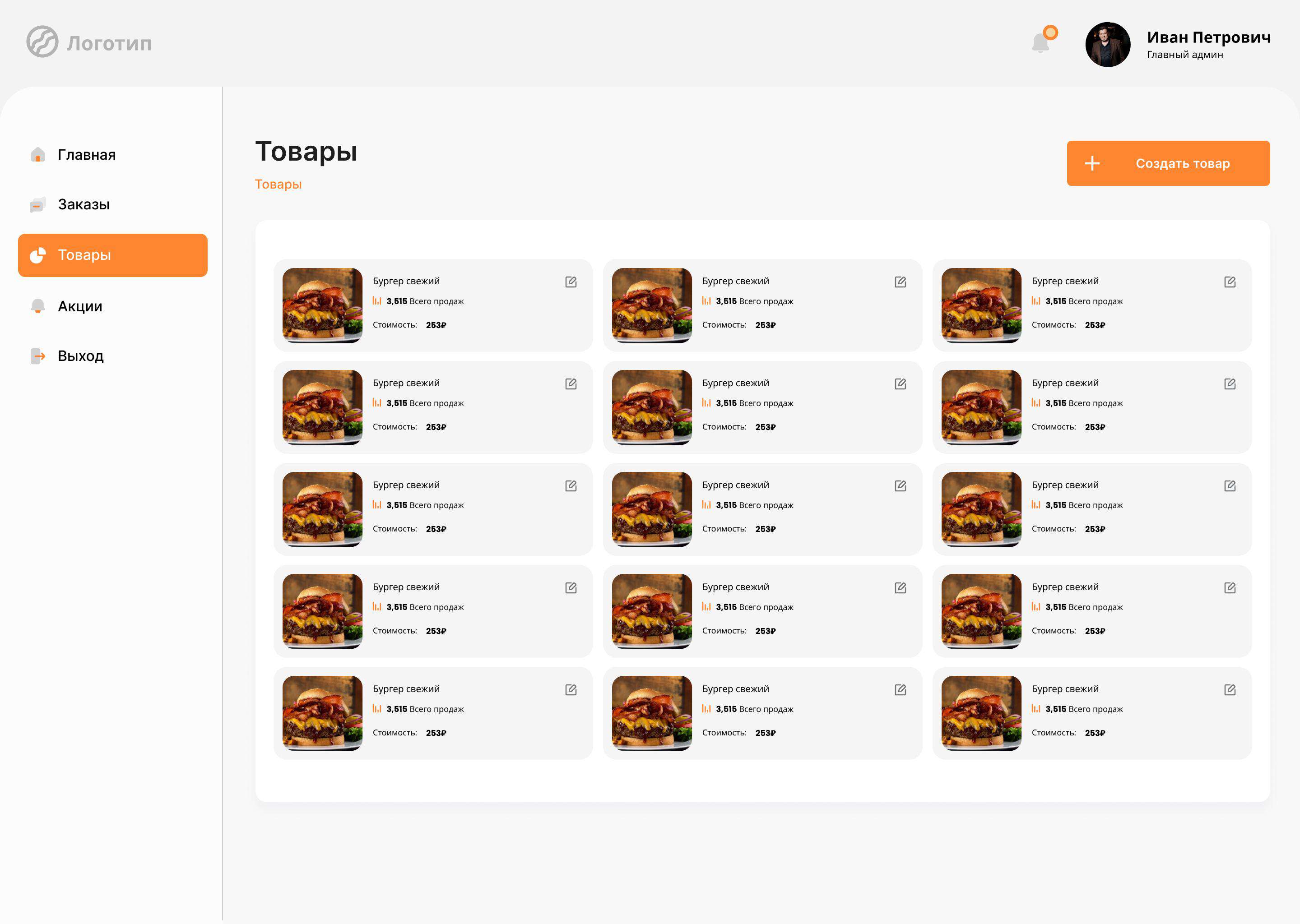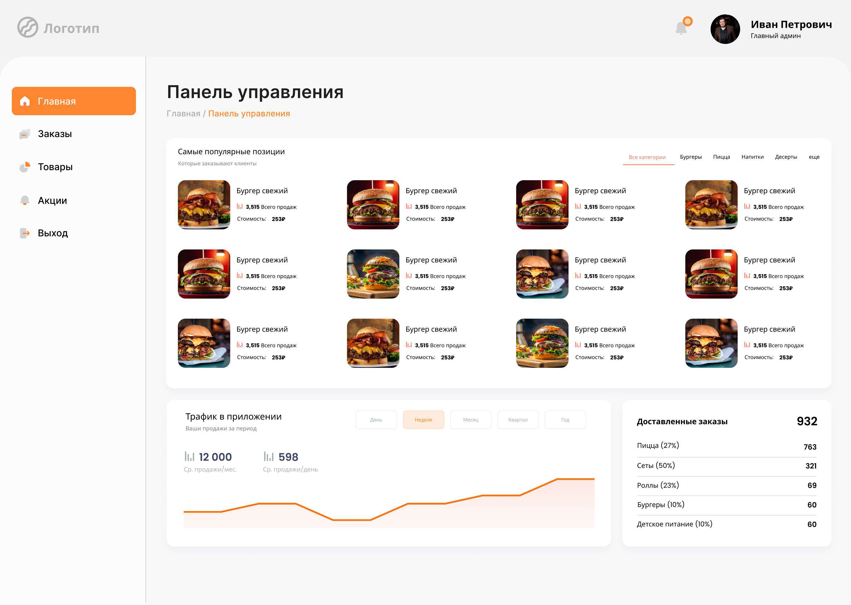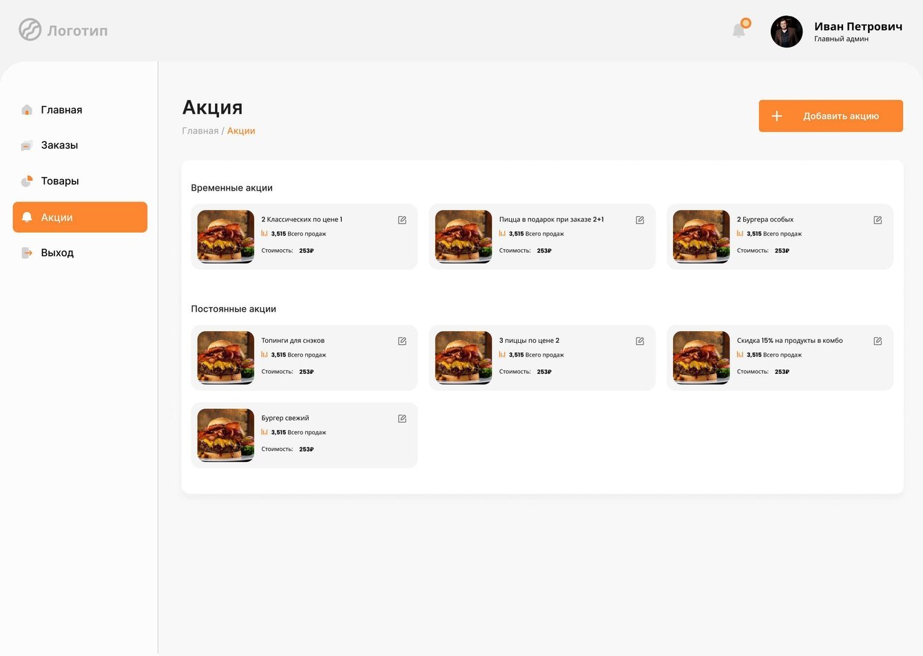 • Главное меню с навигацией по основным разделам (главная, товары, акции, заказы, выход)
