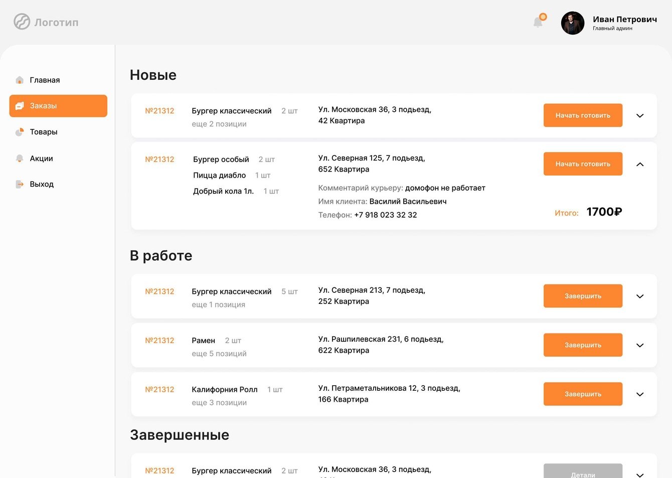 • Кнопки взаимодействия: начать готовить, завершить заказ
