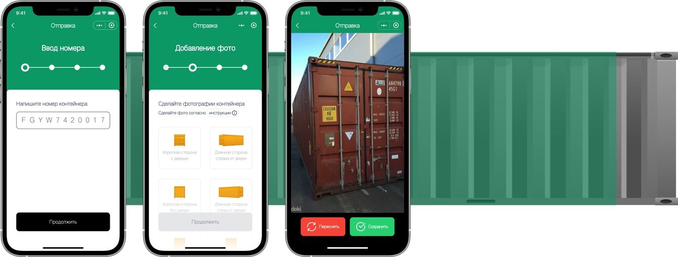 Отправка контейнера происходит в следующей последовательности: пользователь заводит номер контейнера в специально отведенном поле, после проверки длины номера, делаем фотографии контейнера в соответствии с инструкцией.