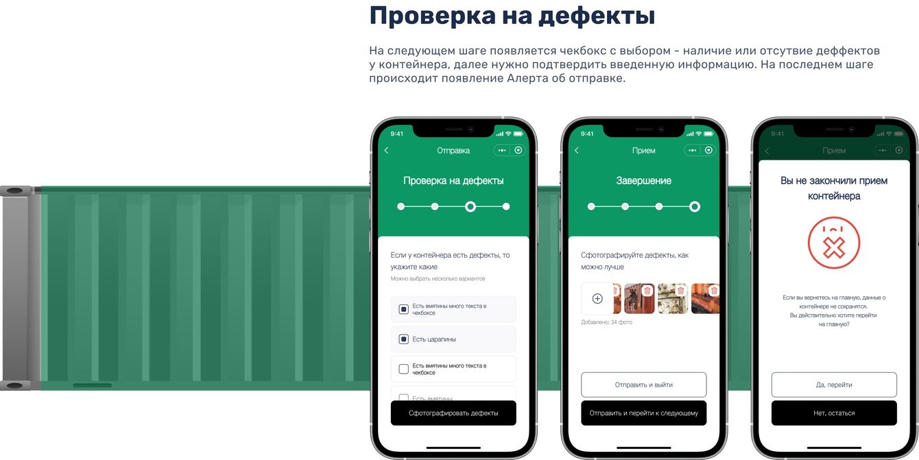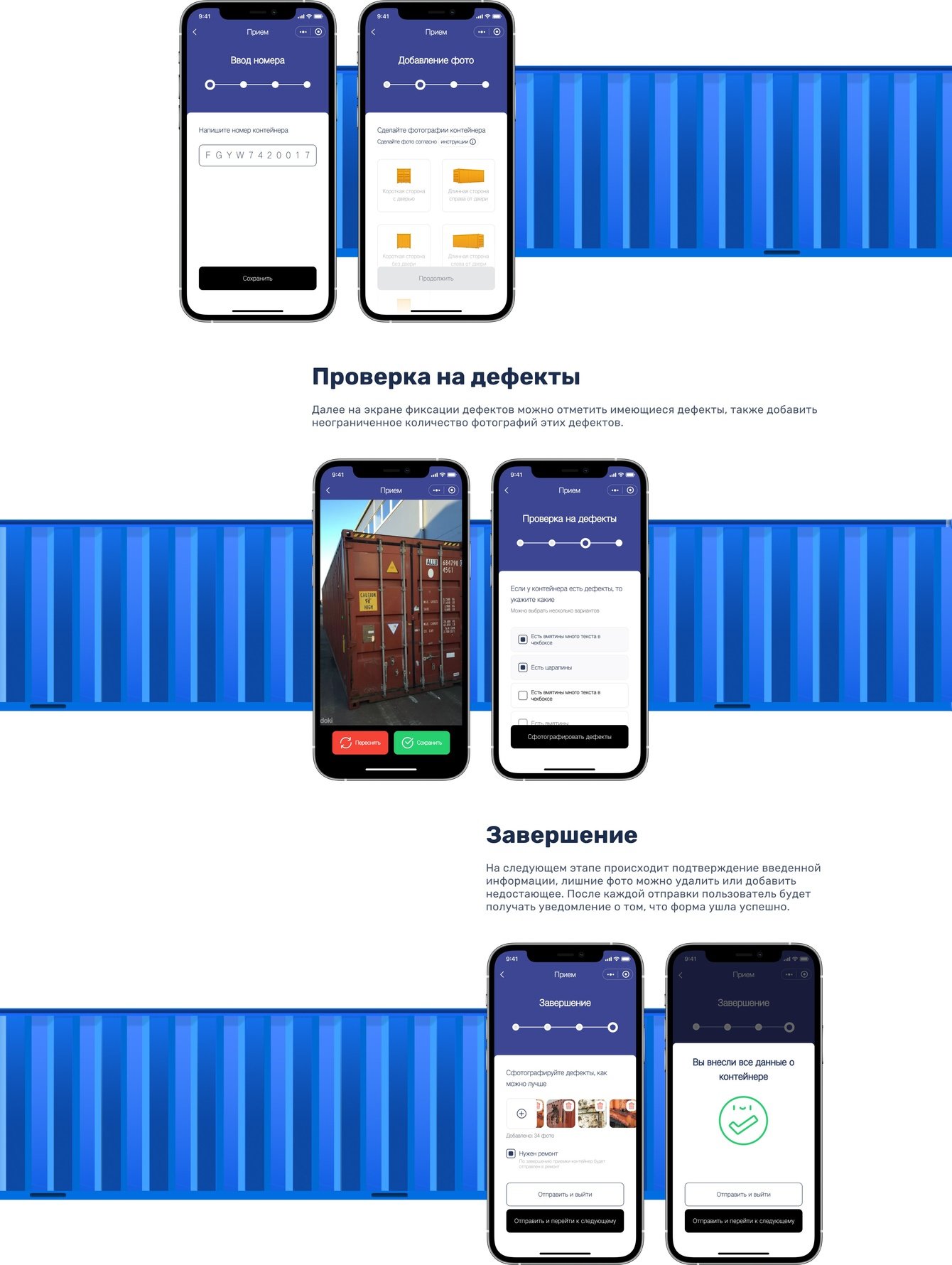Прием контейнера происходит поэтапно: пользователь заводит номер контейнера в специально отведенном поле, после проверки длины номера делает фотографии контейнера с разных сторон.
