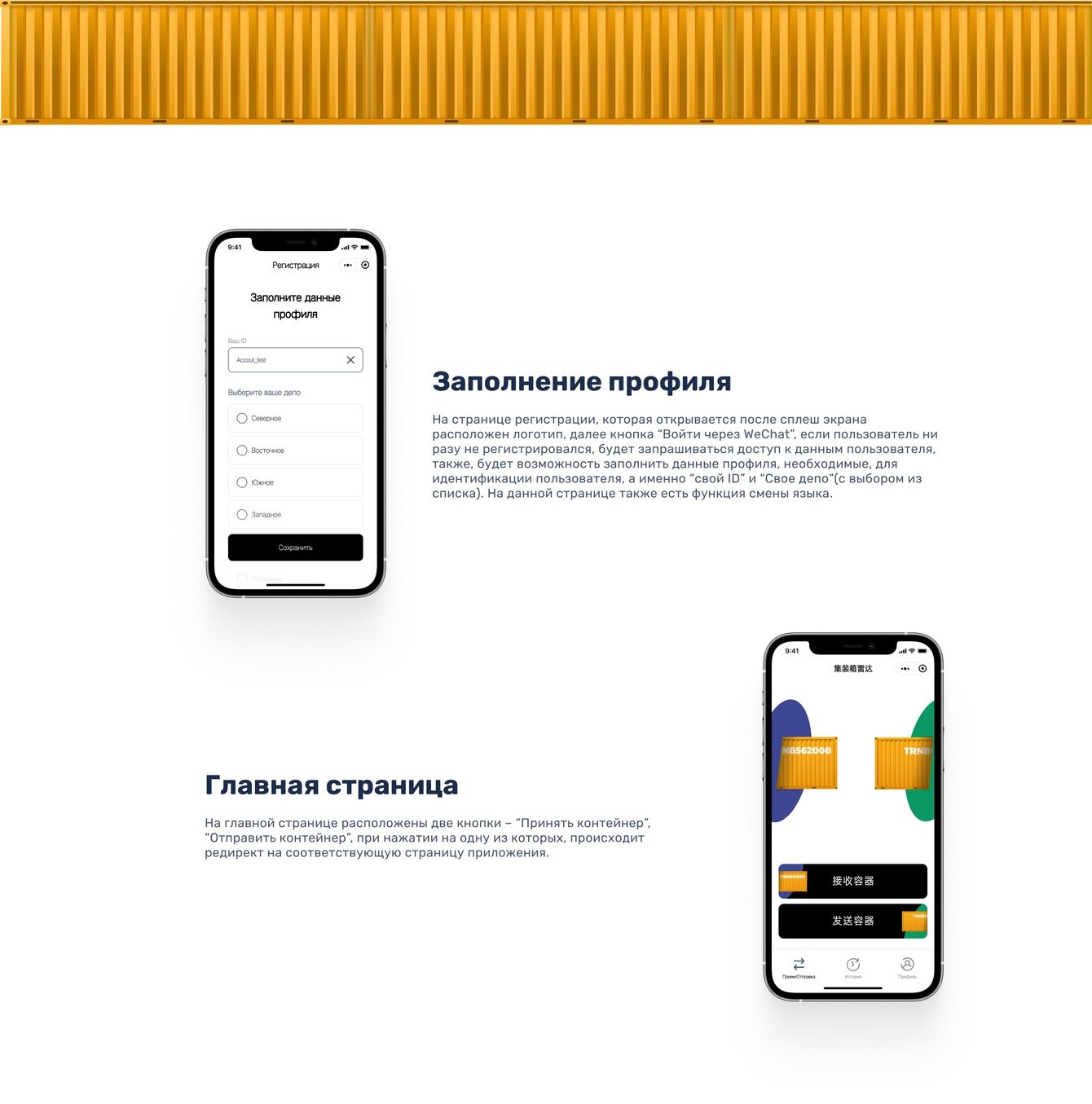 Наша команда разработала Wechat мини-приложение для возможности регистрировать контейнер в системе. После попадания контейнера в систему, через админ панель администратор депо может просматривать всю информацию по движению контейнеров, увидеть геолокацию, фотографии контейнера, фотографии дефектов.