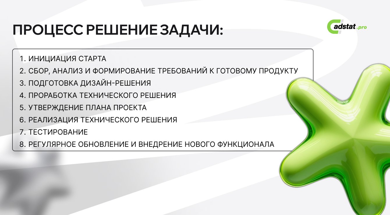 Также, понимая объем предстоящей работы, темп изменений на рынке и необходимость в развитии, на этом этапе команда системы Adstat.pro выделила для себя такие задачи: