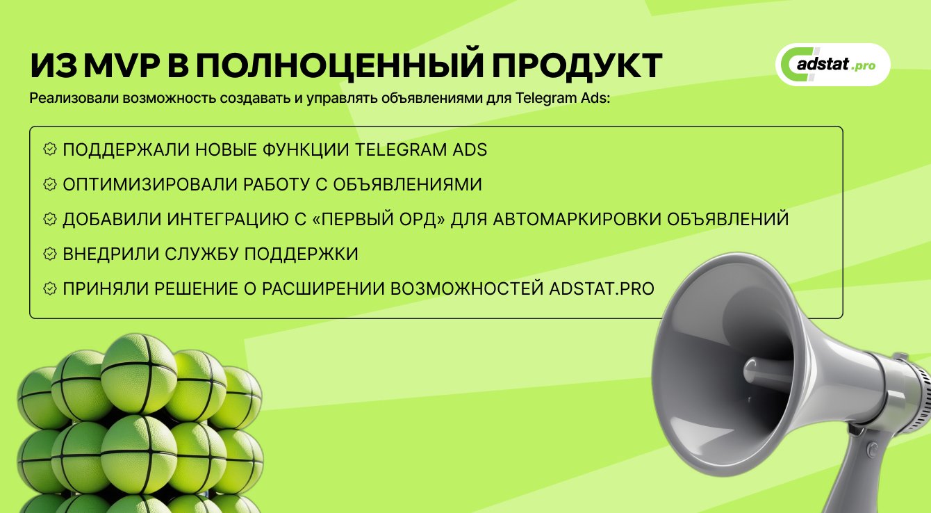 • все это время развивался и менялся не только Adstat.pro. Сама платформа Telegram Ads также постоянно совершенствовалась и добавляла новые возможности. Поэтому нам очень важно было оперативно отслеживать их, а также изменения в алгоритмах и политике Telegram, и учитывать при разработке, поддерживая нововведения в рамках системы Adstat.pro.