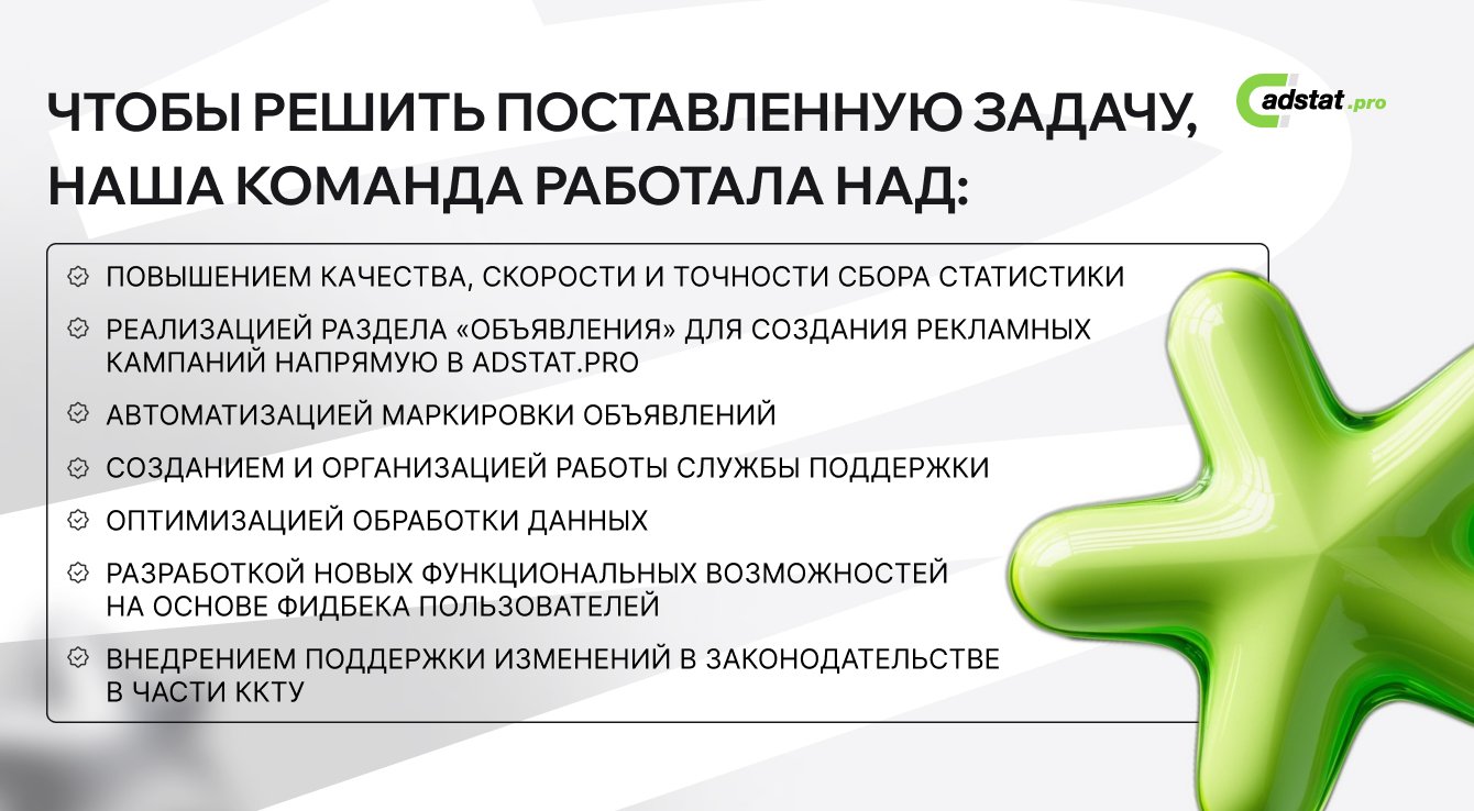 Также, понимая объем предстоящей работы, темп изменений на рынке и необходимость в развитии, на этом этапе команда системы Adstat.pro выделила для себя такие задачи: