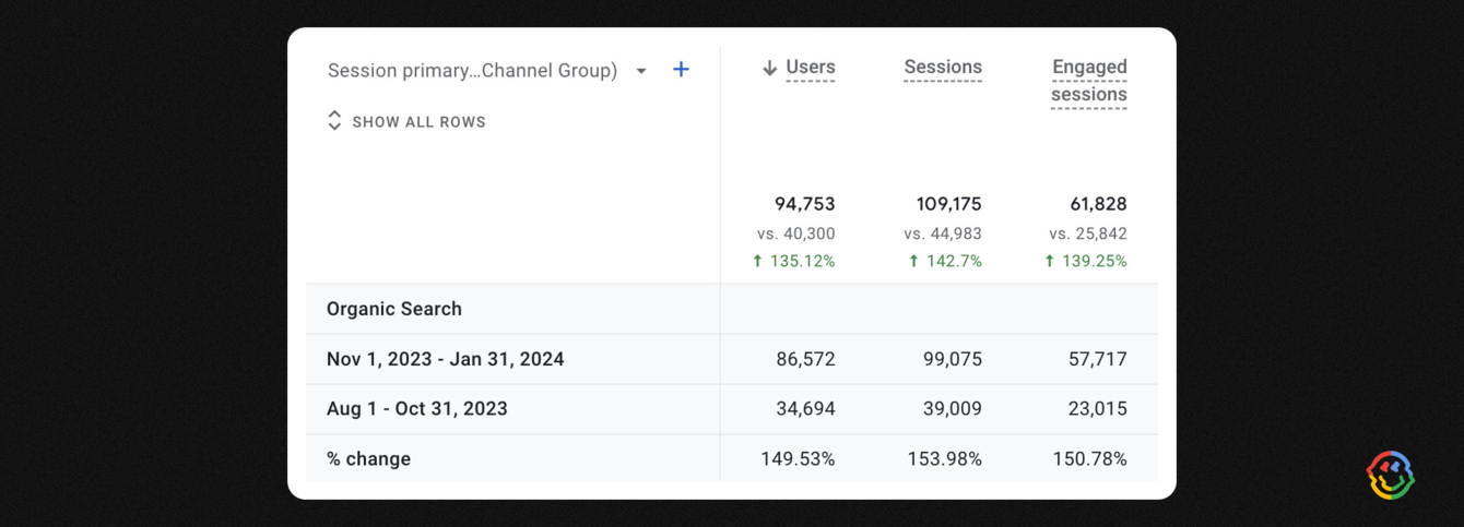 С ноября 2023 по январь 2024 количество пользователей возросло на 149,53%, количество сессий — на 153,98%, количество вовлеченных сессий — на 150,78% по сравнению с предыдущим периодом август–октябрь 2023