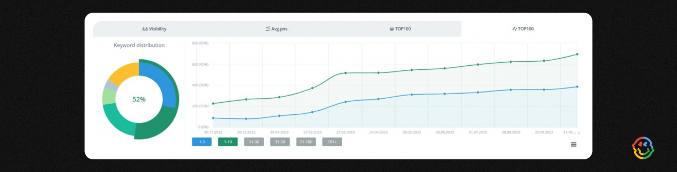 Количество ключевых слов в топ-3 с ноября 2022 по октябрь 2023 выросло с 88 до 386, а в топ-10 — с 225 до 695