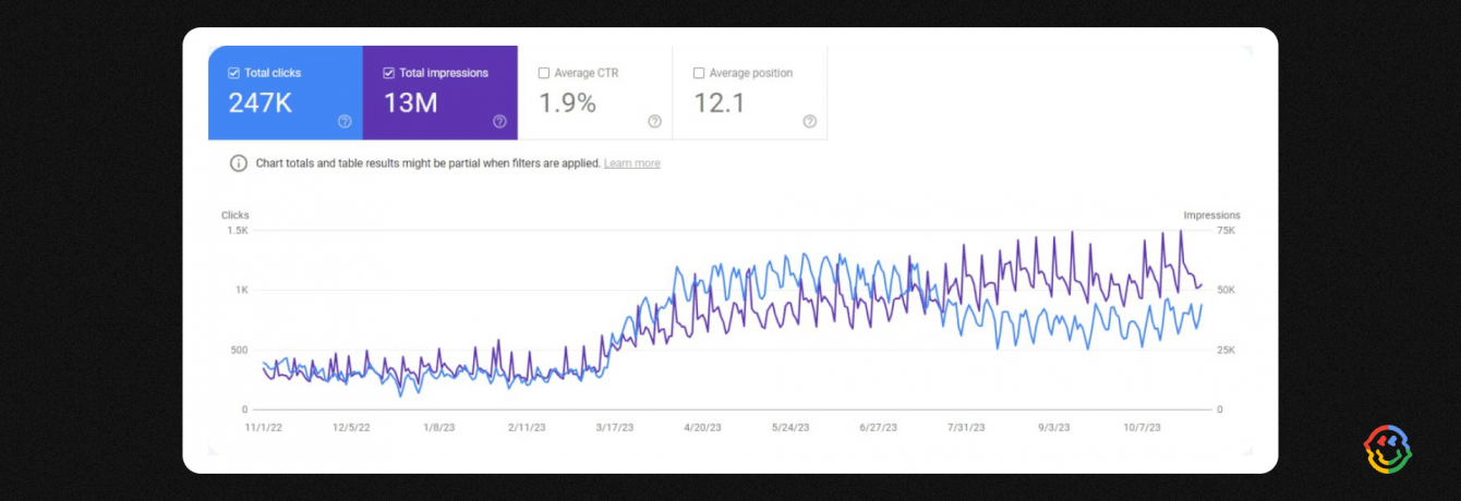 Общее количество кликов и показов с января 2022 по июль 2023 возросло с 500 до 75 000