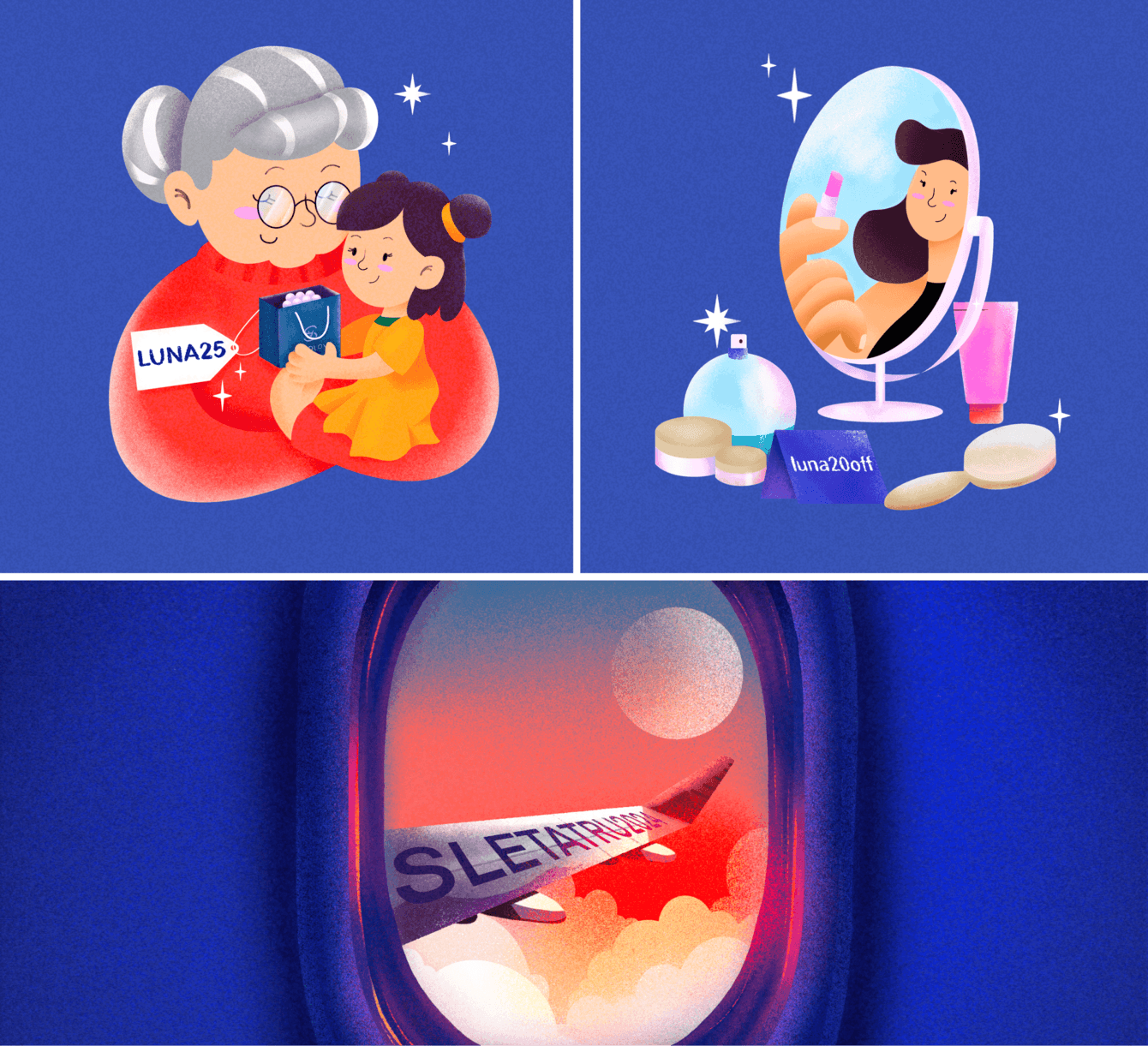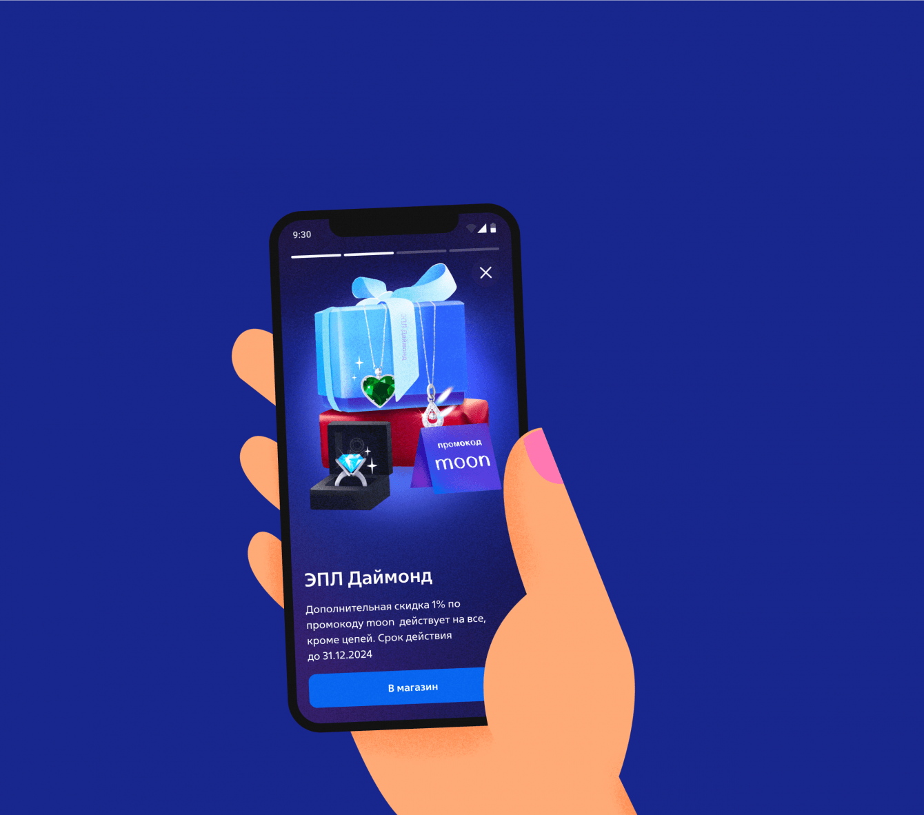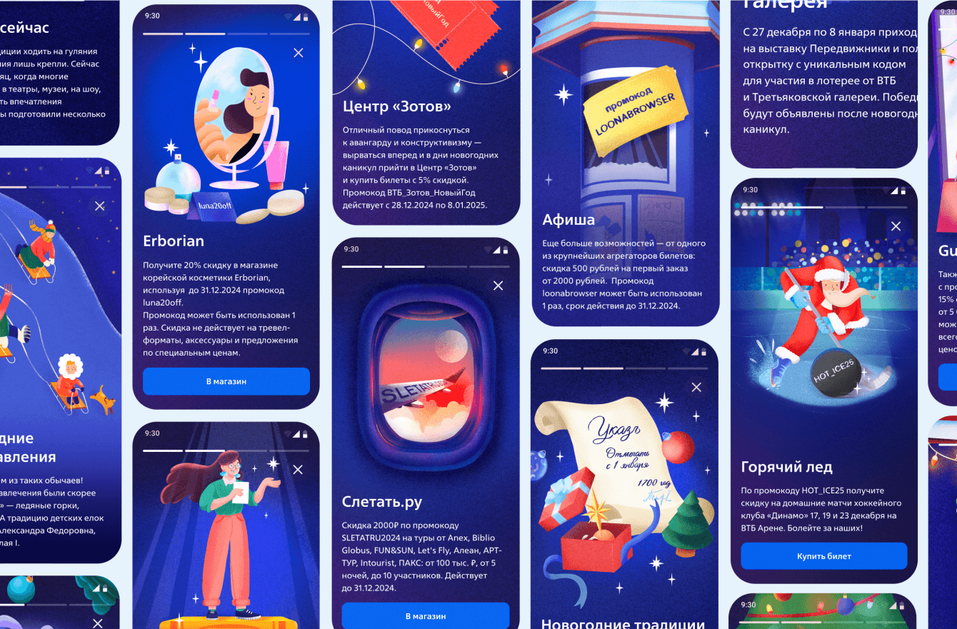 Так, скидка на ювелирные изделия была связана с семейными традициями: появились иллюстрации бабушки, которая дарит украшение внучке. Промокод на доставку цветов обыграли изображением с влюбленной парой, празднующей Новый год. Каждый визуал был больше чем просто картинка — это был источник радости и вдохновения.