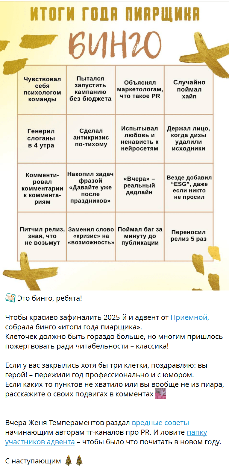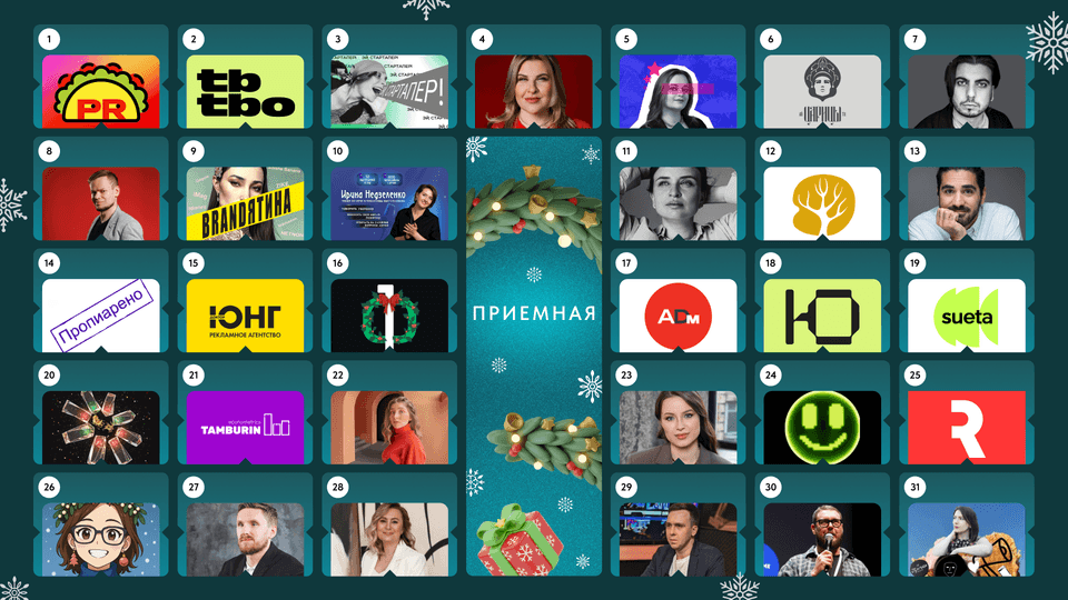 Переходя из одного канала в другой, аудитория погружалась в новогоднюю атмосферу. Участники адвента рассказывали про новогодний брендинг, репутационную гигиену, праздничные рассылки для блогеров, особенности B2B-маркетинга в 2026 году, тренды, желания, архетипы, развлечения и другие интересные темы.