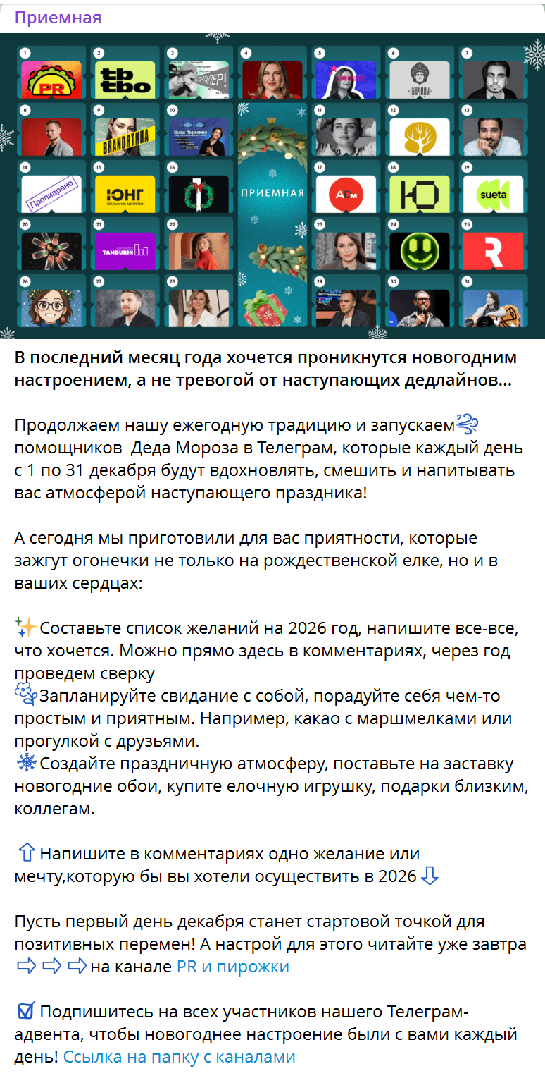 Наша задача напоминала сбор сложного пазла, где каждый фрагмент — это независимый Telegram-канал со своим контентом, аудиторией и правилами. Нужно было не просто договориться о сотрудничестве с 31 каналом, но и синхронизировать каждый в едином новогоднем марафоне, создать бесшовную сеть взаимного продвижения с уникальными взаимодополняющими историями. Тут вы спросите: «Почему 31, вы же пишете 32?» Из-за большого числа желающих мы придумали и запустили адвент в Приемной, канале агентства GromPR, а уже другие участники создавали и публиковали тематические посты.