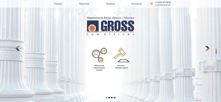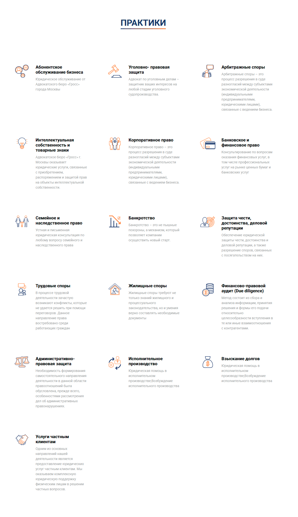 Офисы компании находятся в городе Москве и Белгороде. И, учитывая специфику деятельности, сайт компании должен предоставлять пользователям много текстовой информации об услугах и деятельности бюро.