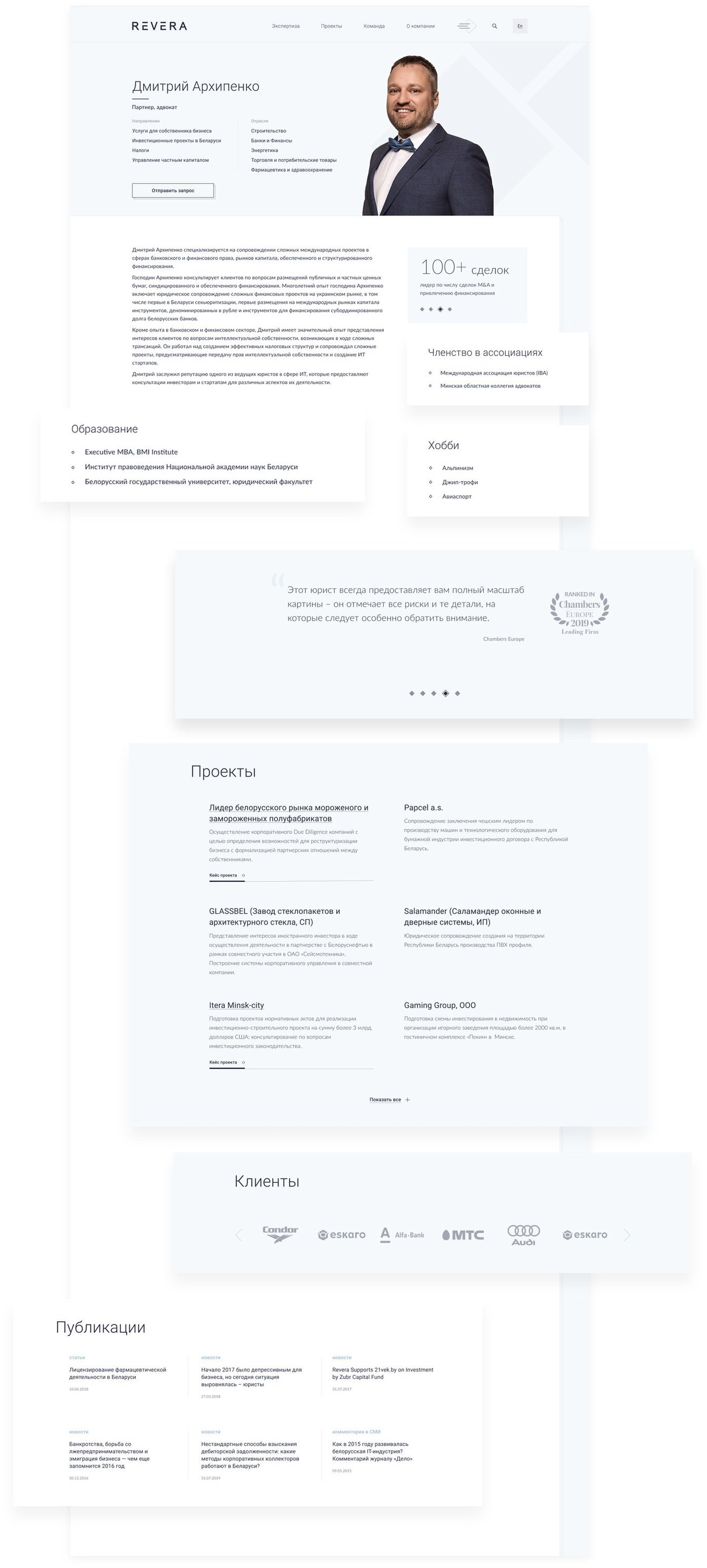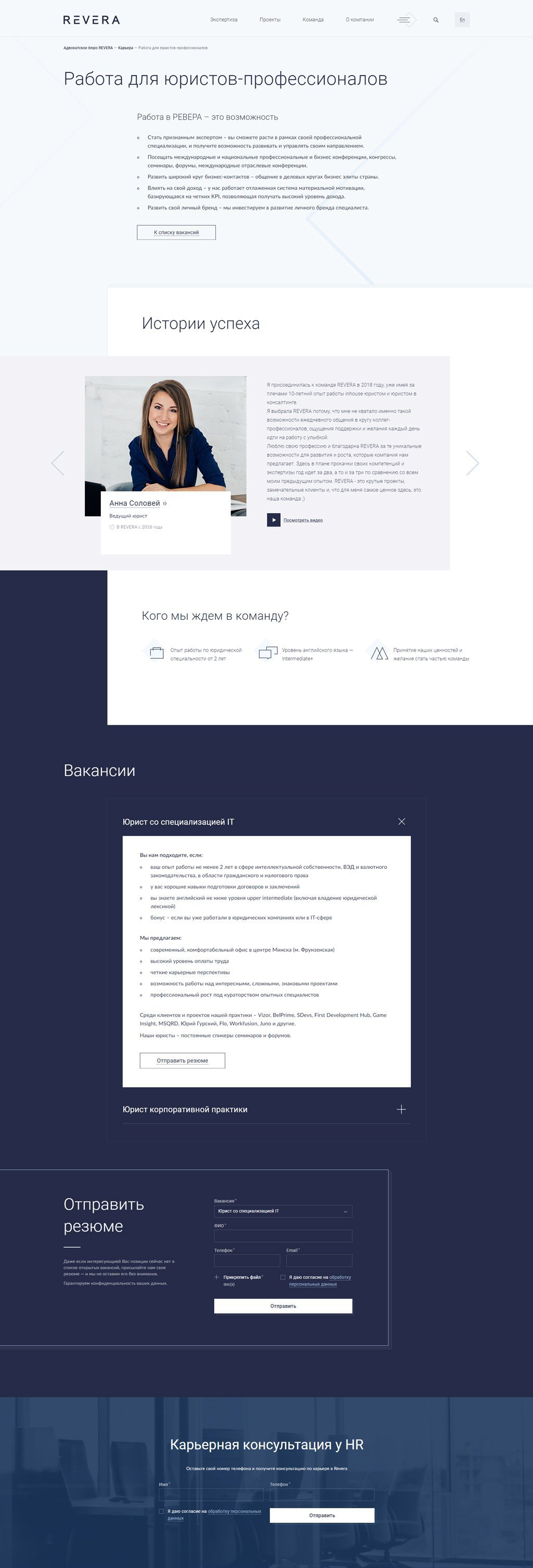 Здесь потенциальный клиент может познакомиться с командой REVERA. С помощью фильтра можно узнать, по каким направлениям работает тот или иной специалист. Также искать адвоката/юриста можно и по отраслям.