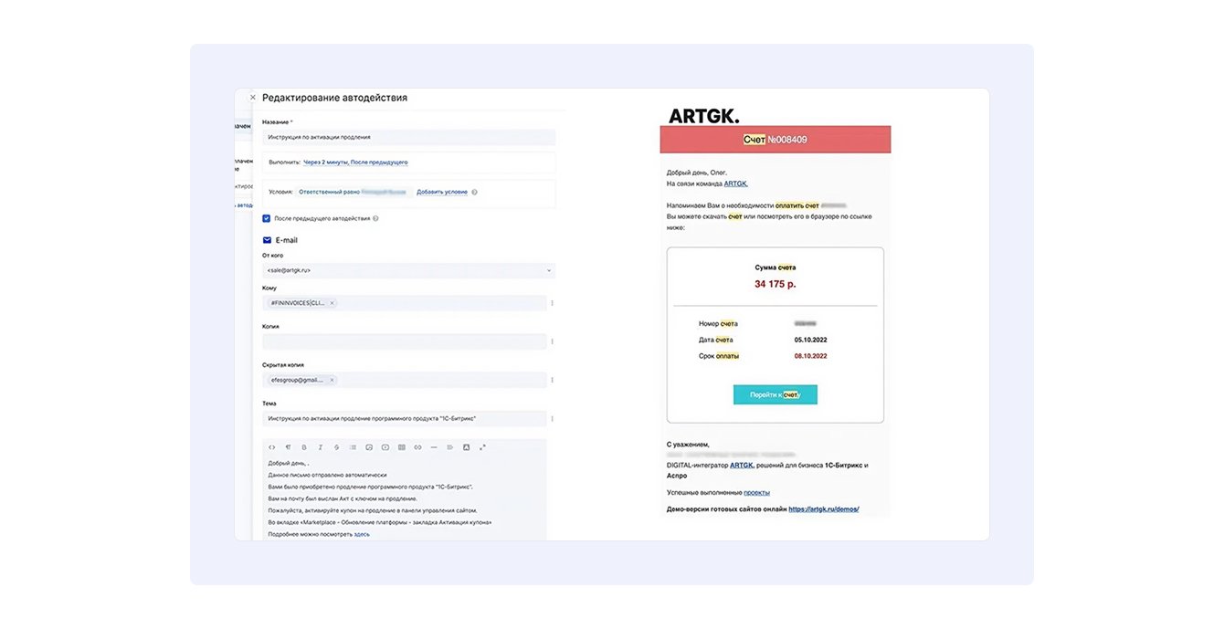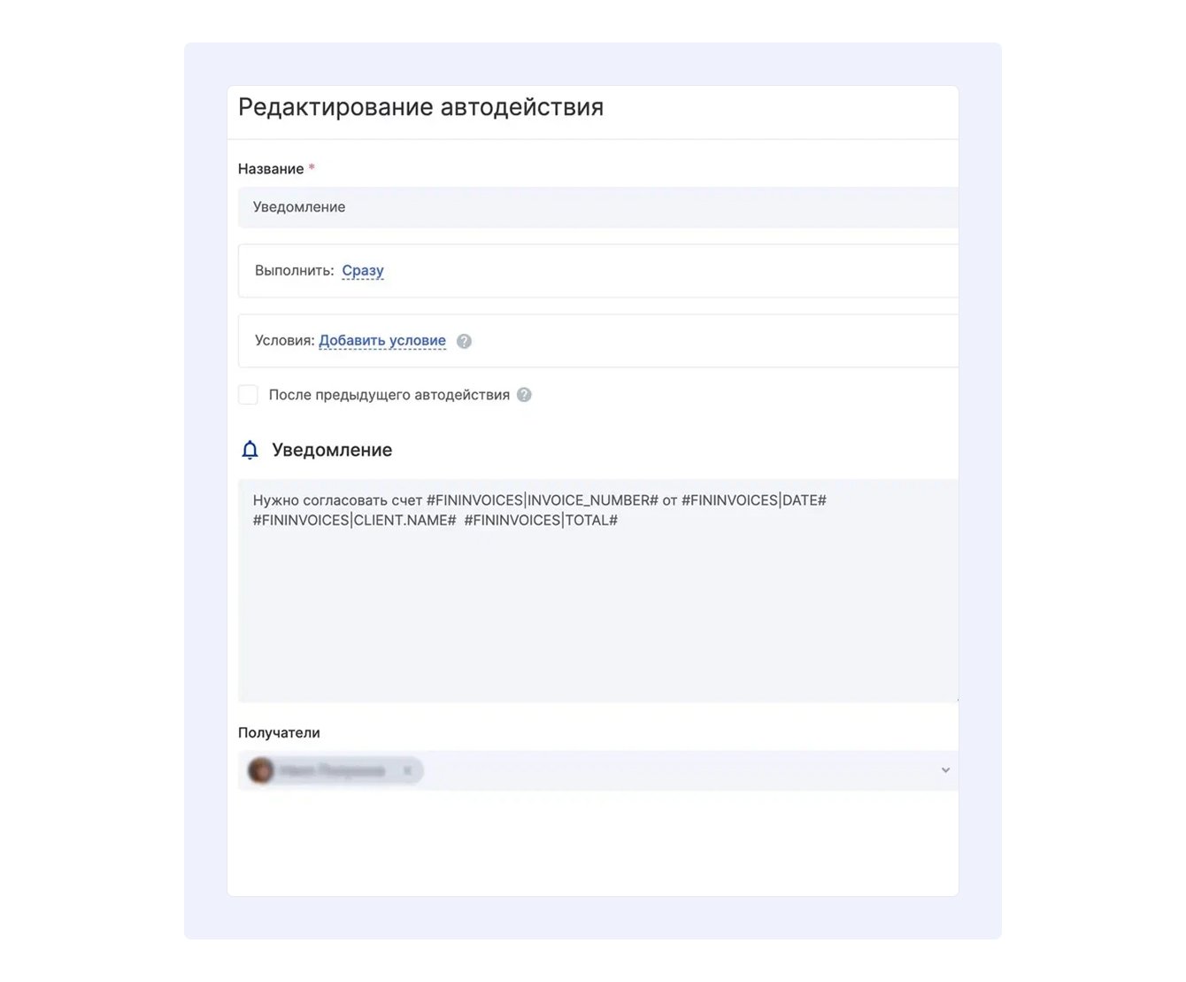Сотрудникам достаточно выбрать услугу и направить счет на согласование. При задержке отправки через CRM принудительное автодействие автоматически высылает документ клиенту через час. Ежедневно агентство формирует 20-30 счетов, процедура согласования занимает минуты.