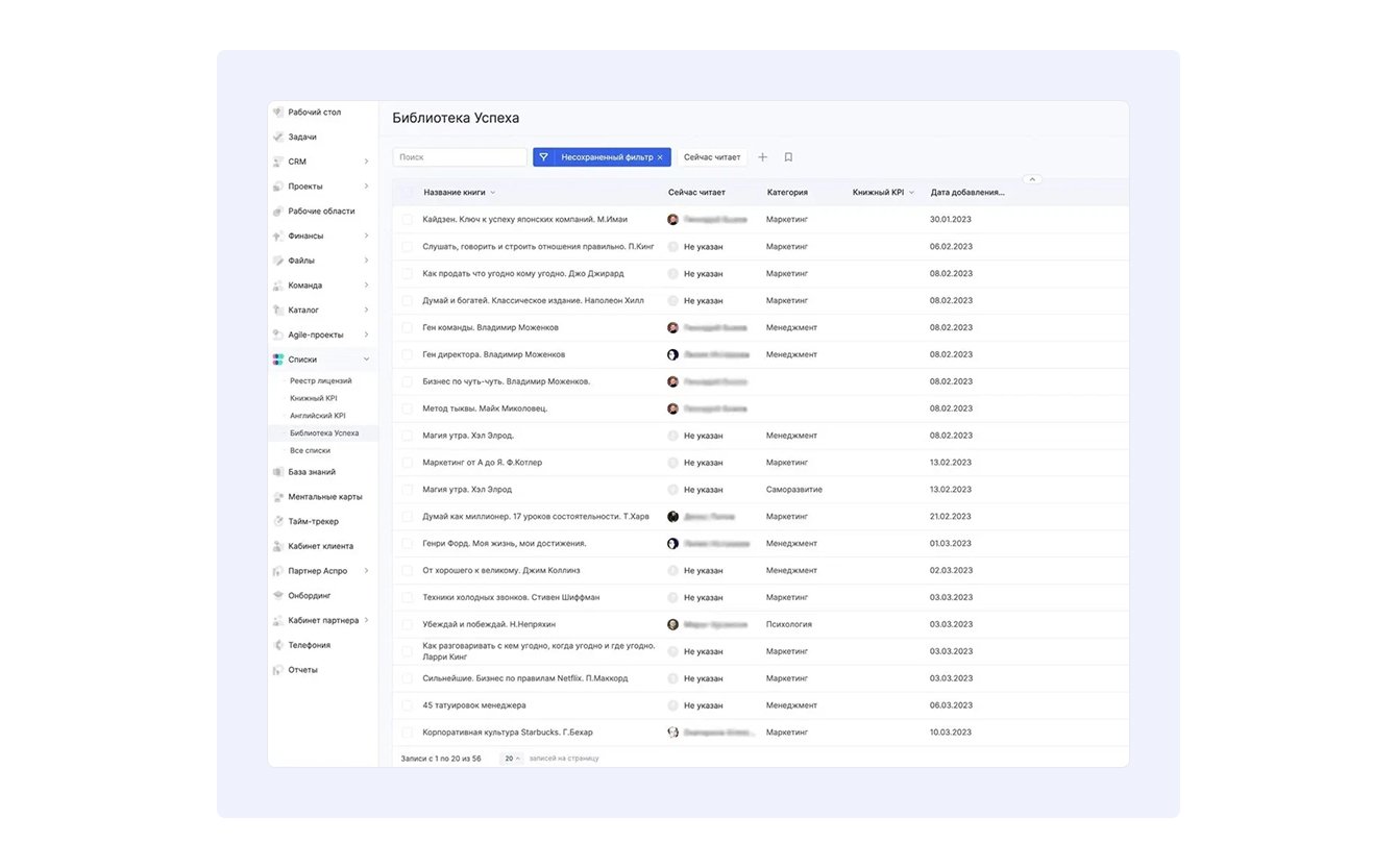 Модуль «Списки» отслеживает движение литературы — кто взял книги и когда планирует возврат. Коллеги видят доступность изданий в режиме реального времени.