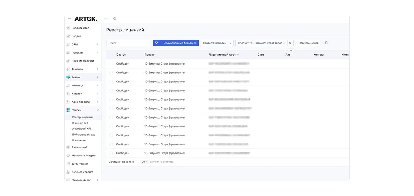Модуль «Списки» содержит реестр всех доступных лицензий. После поступления оплаты покупатель автоматически получает купон активации с подробной инструкцией: