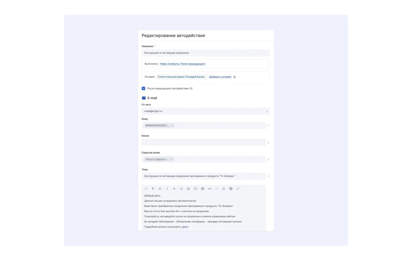 Агентство реализует лицензионные продукты 1С-Битрикс и Аспро. Ранее менеджеры отправляли активационные ключи вручную, теперь процесс полностью автоматизирован.