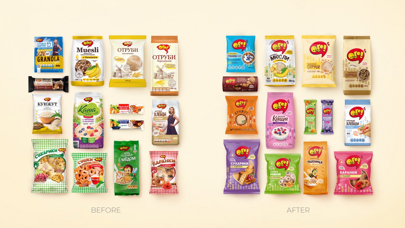 Перед DS1 стояла также задача разработать систему дизайна и дифференциации для всей продукции “Ого!”. Чтобы потребитель сразу мог узнать любимый бренд и легко ориентировался в ассортименте.
