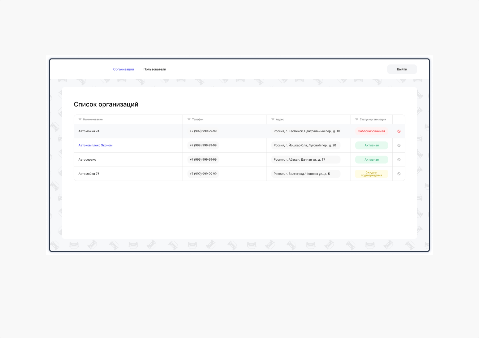 Администратор системы может просматривать информацию об организациях и пользователях системы. Есть система ручной модерации новых автомоек, когда Администратор одобряет или отклоняет заявки от новых организаций.