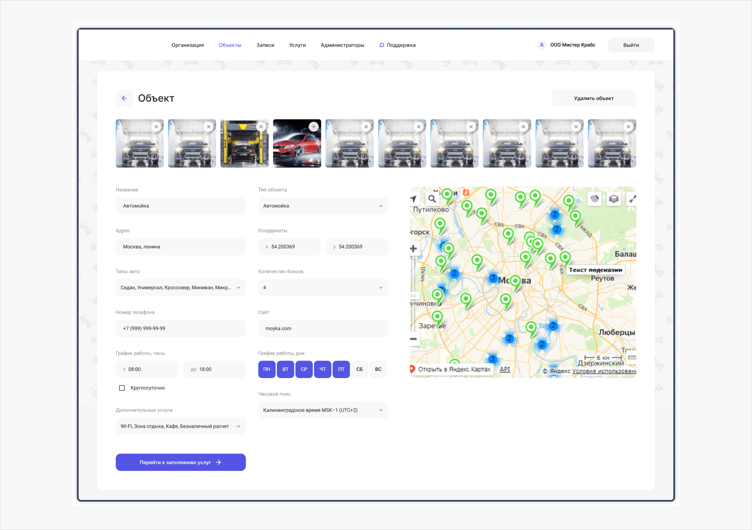 В панели администратора можно редактировать данные об автомойке, добавлять фотографии, редактировать описание и график работы.