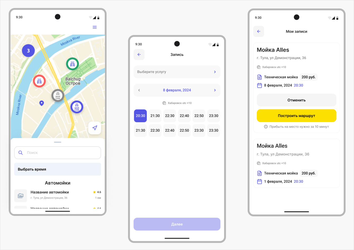 Приложение для Android и iOS позволяет клиентам записываться на услуги, просматривать доступные автомойки, и получать уведомления о статусе записей.