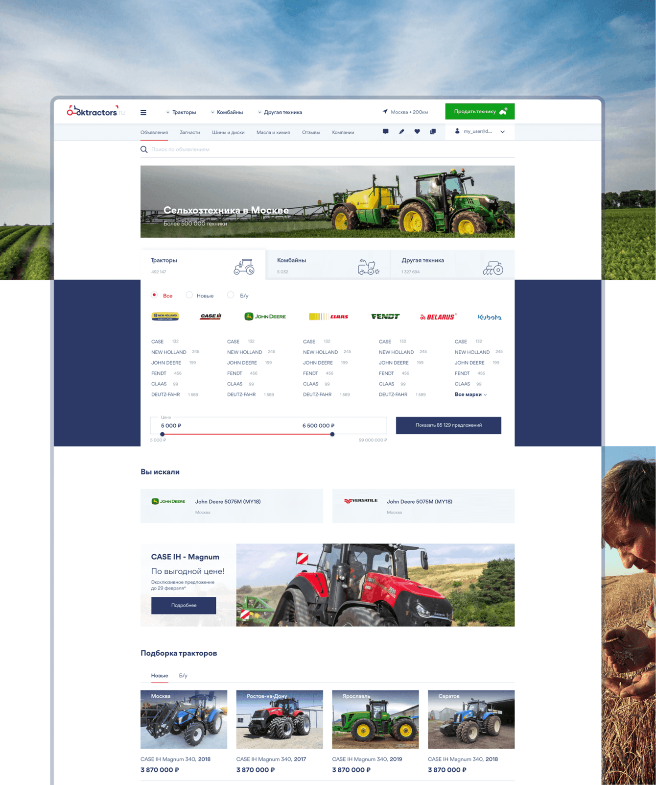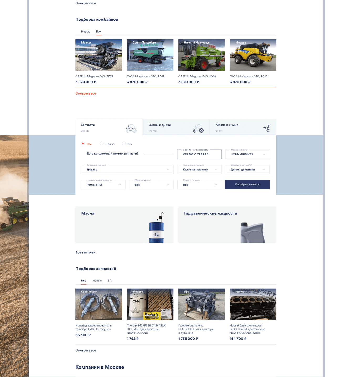 Разработать многостраничный портал-агрегатор для покупки, продажи и аренды сельскохозяйственной техники и комплектующих по России и СНГ. Порталу необходимо было предоставить удобные инструменты для взаимодействия между покупателями и продавцами, включая личный кабинет и онлайн-калькулятор для подбора техники.