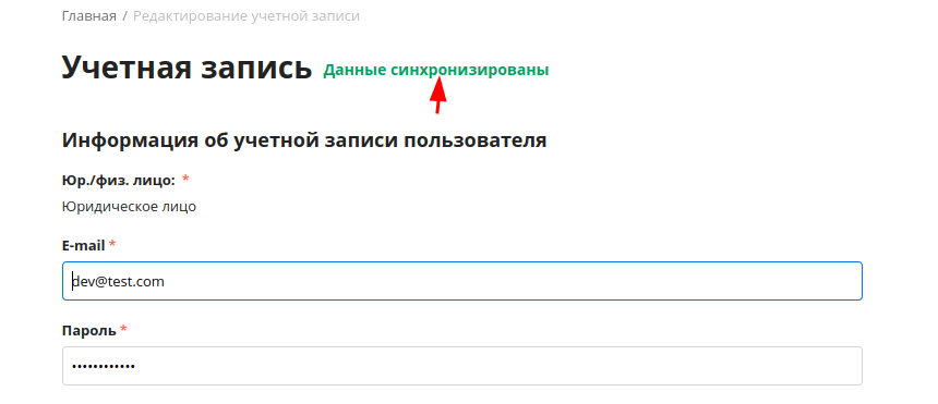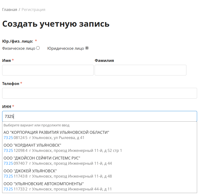 Если покупатель выберет тип учетной записи «Юридическое лицо», то ему будет нужно ввести только свой ИНН. Дополнительные поля при этом заполнять не нужно.