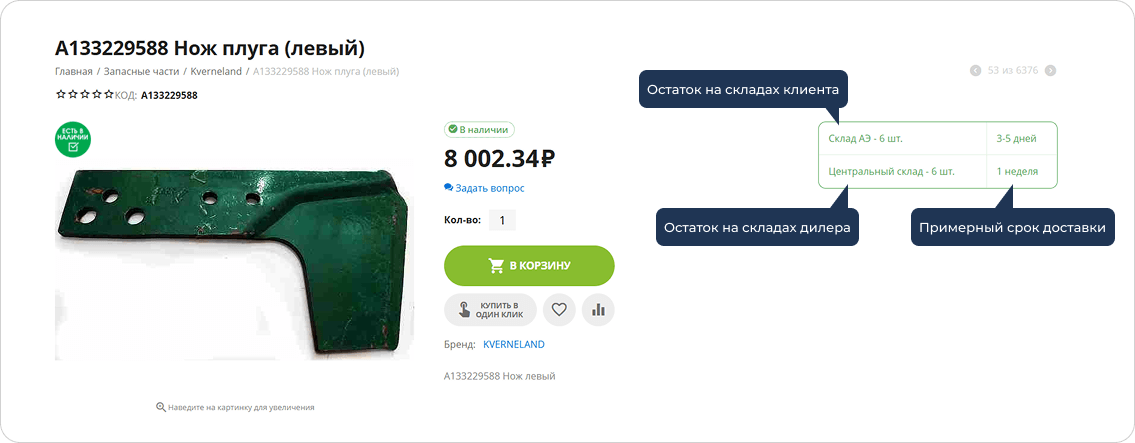 Теперь на детальной странице товара отображается верный остаток на складе (или суммарно на складах клиента/дилера) и примерные сроки его доставки.