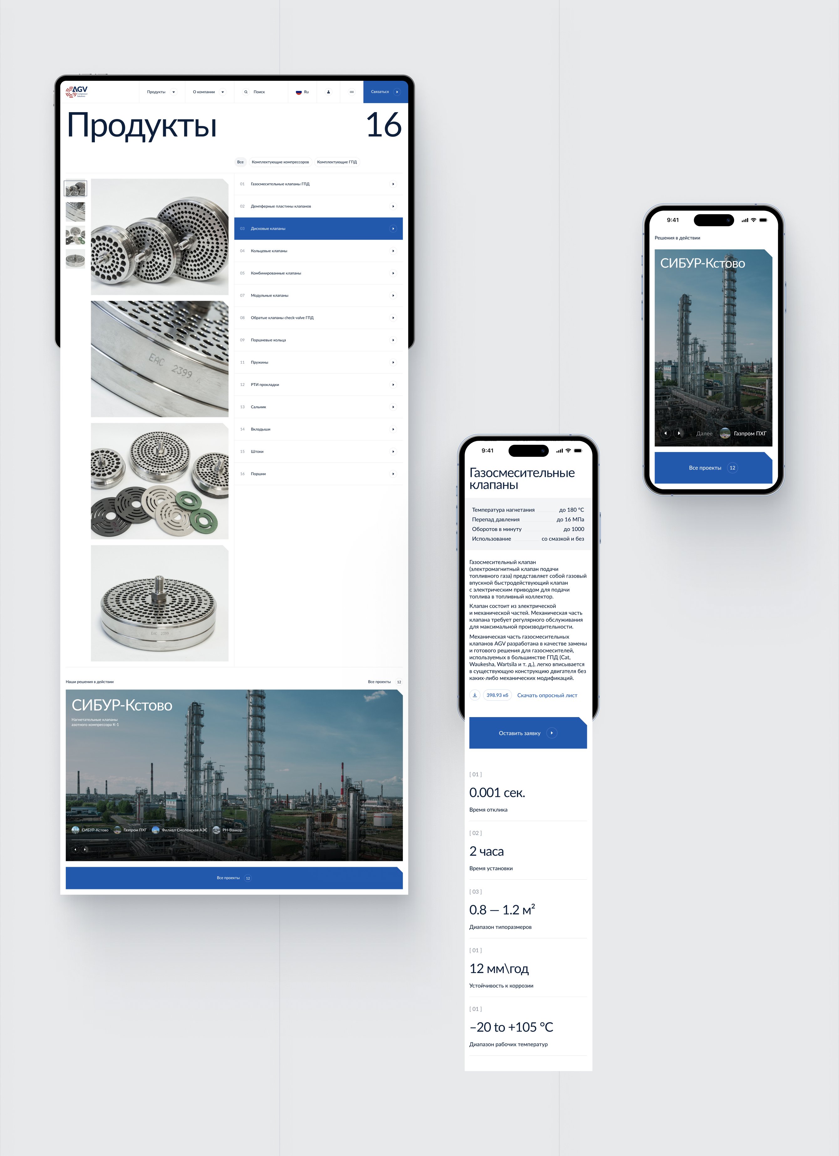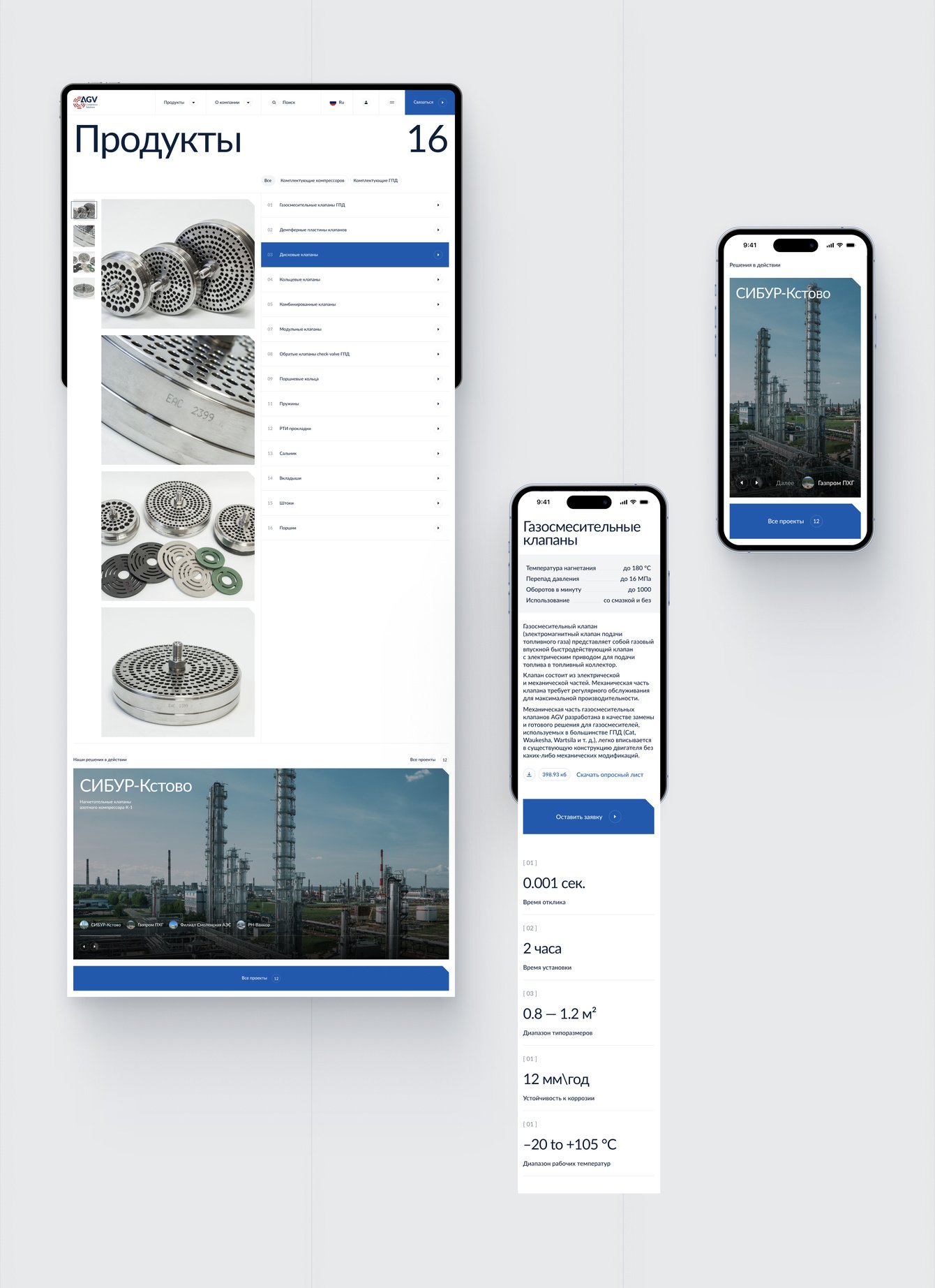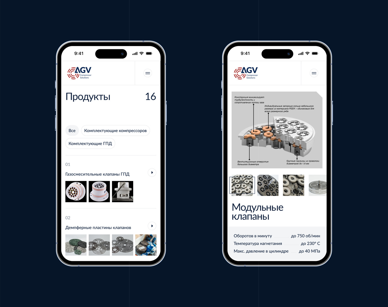 Компания AGV проектирует, производит и поставляет запасные части для поршневых компрессоров и газопоршневых двигателей — различные клапаны, уплотнители и т.д. Такие комплектующие у компании заказывают Газпром, Лукойл, Роснефть и другие корпорации нефтегазовой сферы.