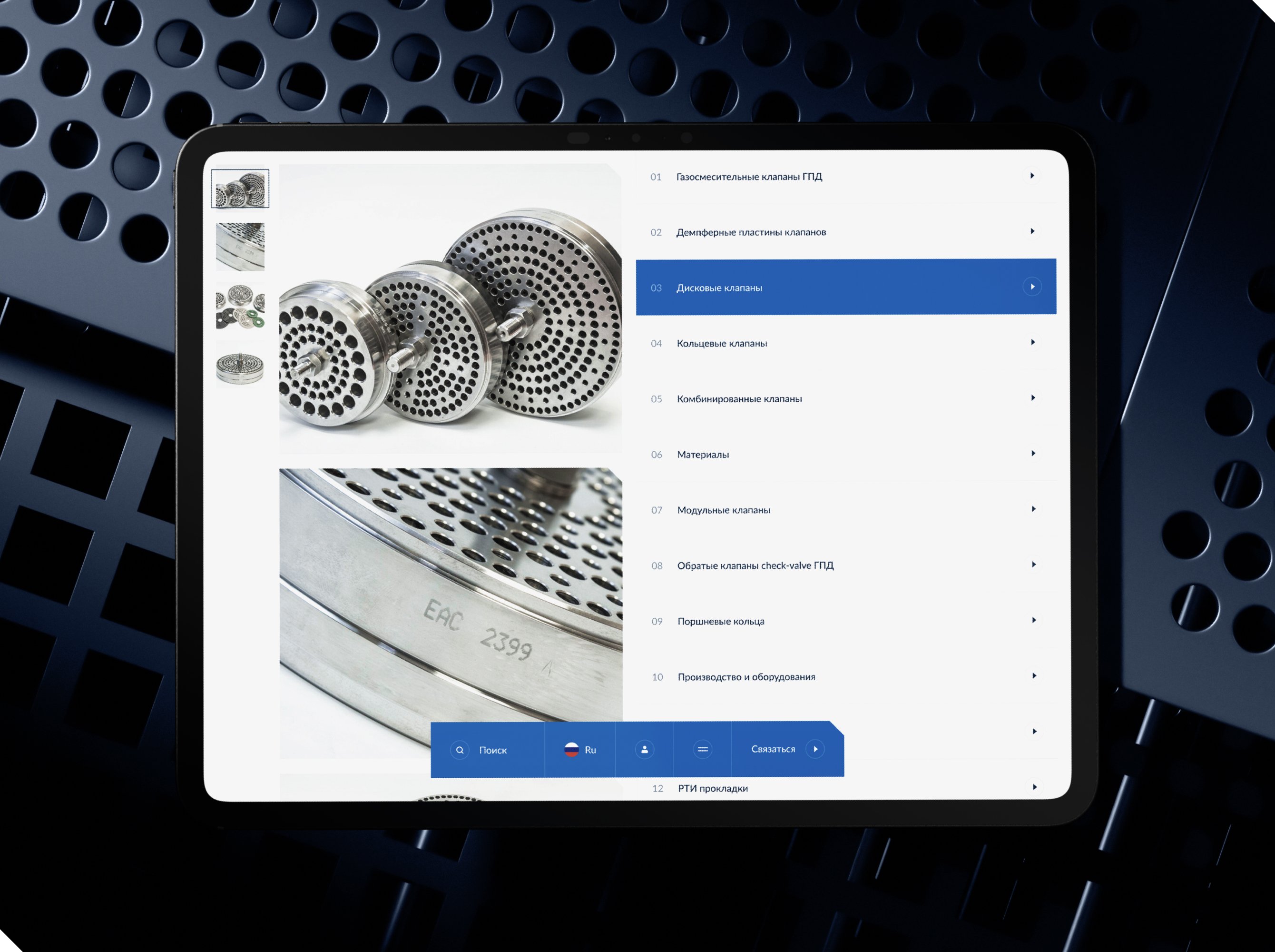 2. Сделать простой, понятный, а главное — наглядный каталог товаров. Компания производит 14 видов расходных элементов к компрессорам разных производителей: это сотни различных наименований. Все эти детали изготавливаются на заказ, по четким требованиям конкретных заказчиков, для конкретных моделей оборудования. Нам нужно было придумать максимально простое решение для каталога, чтобы не заставлять пользователя выбирать нужный вариант из десятков сложных названий.