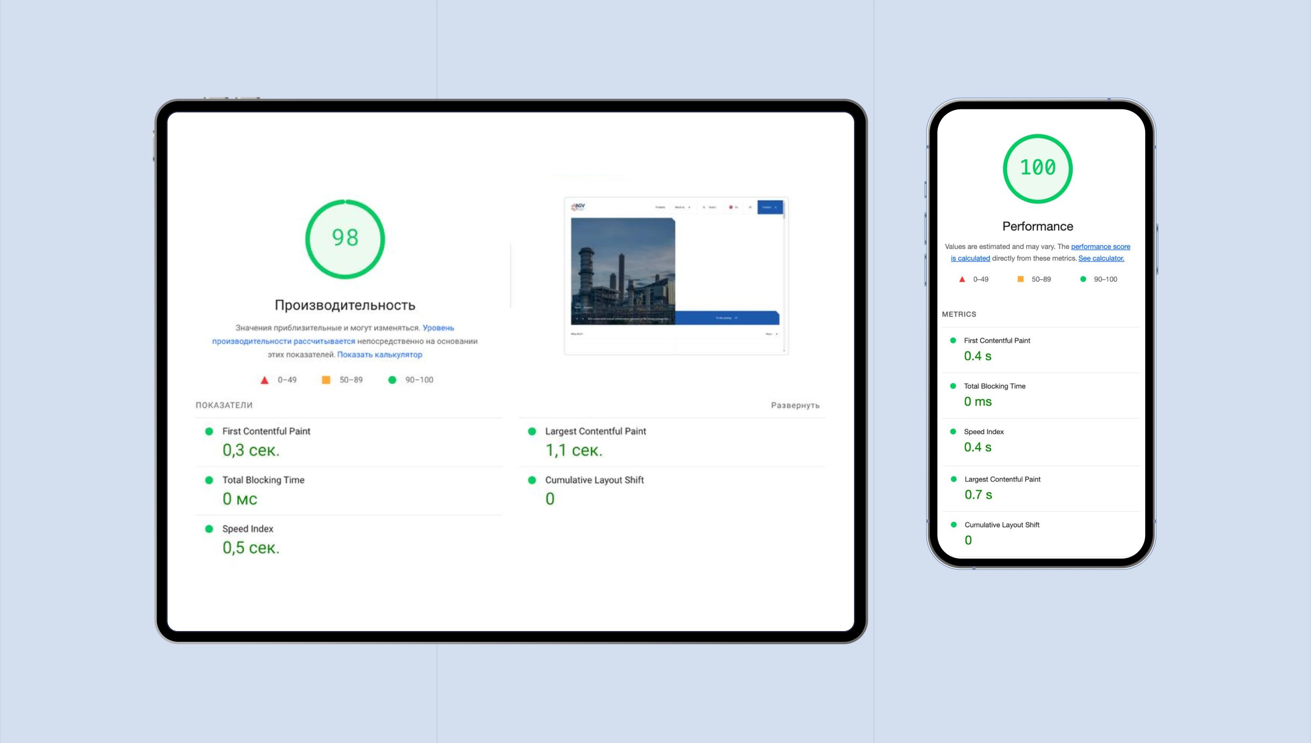 ✔️ Благодаря использованию React+Next.js мы добились максимальных показателей производительности сайта: мобильная версия получила 100 баллов по результатам тестирования в Lighthouse, а десктопная — 98 баллов.