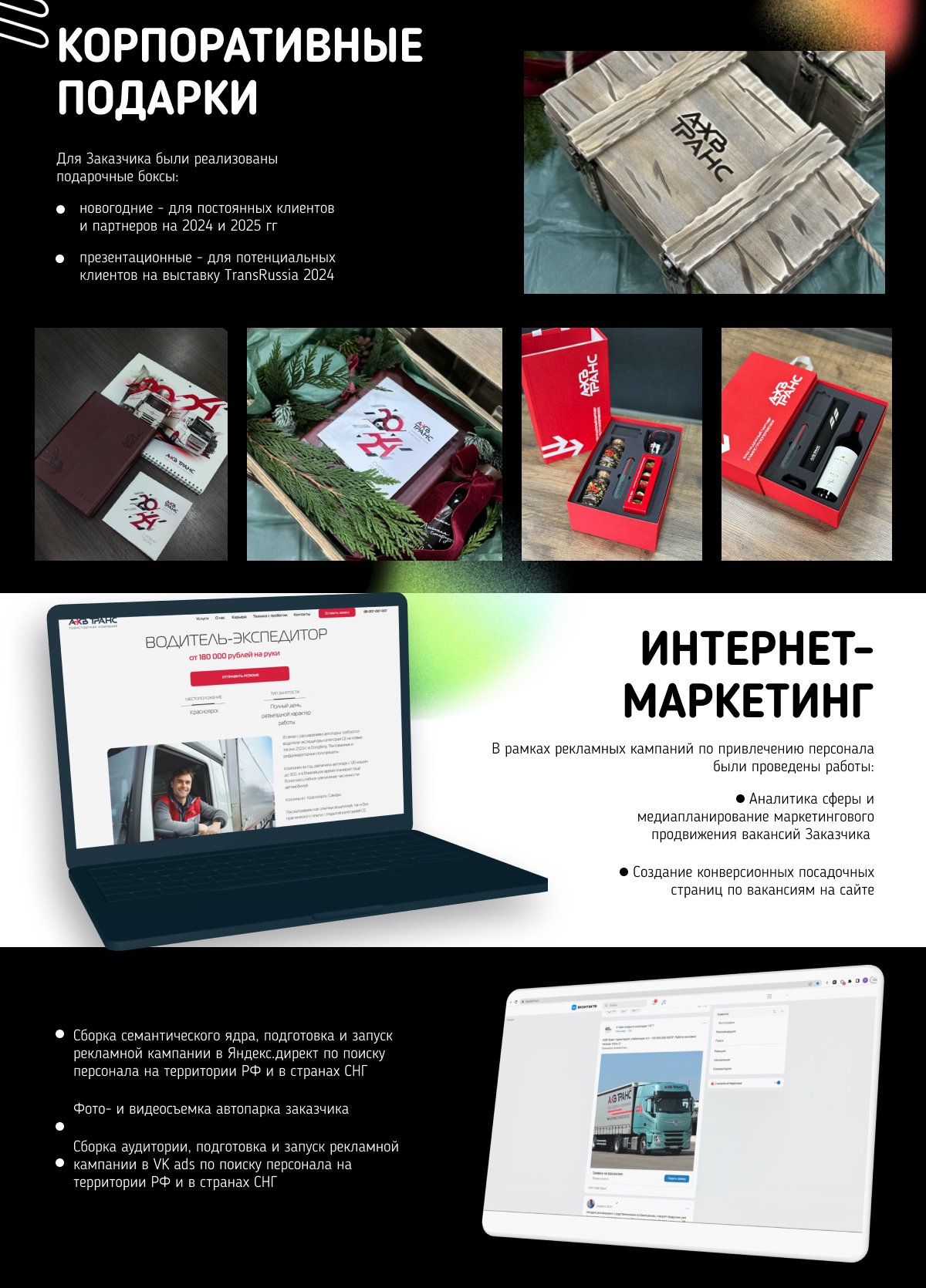 - Рекламная кампания по поиску водителей-экспедиторов, включающая производство фото и видео-контента, таргетинг, контекст, посевы
