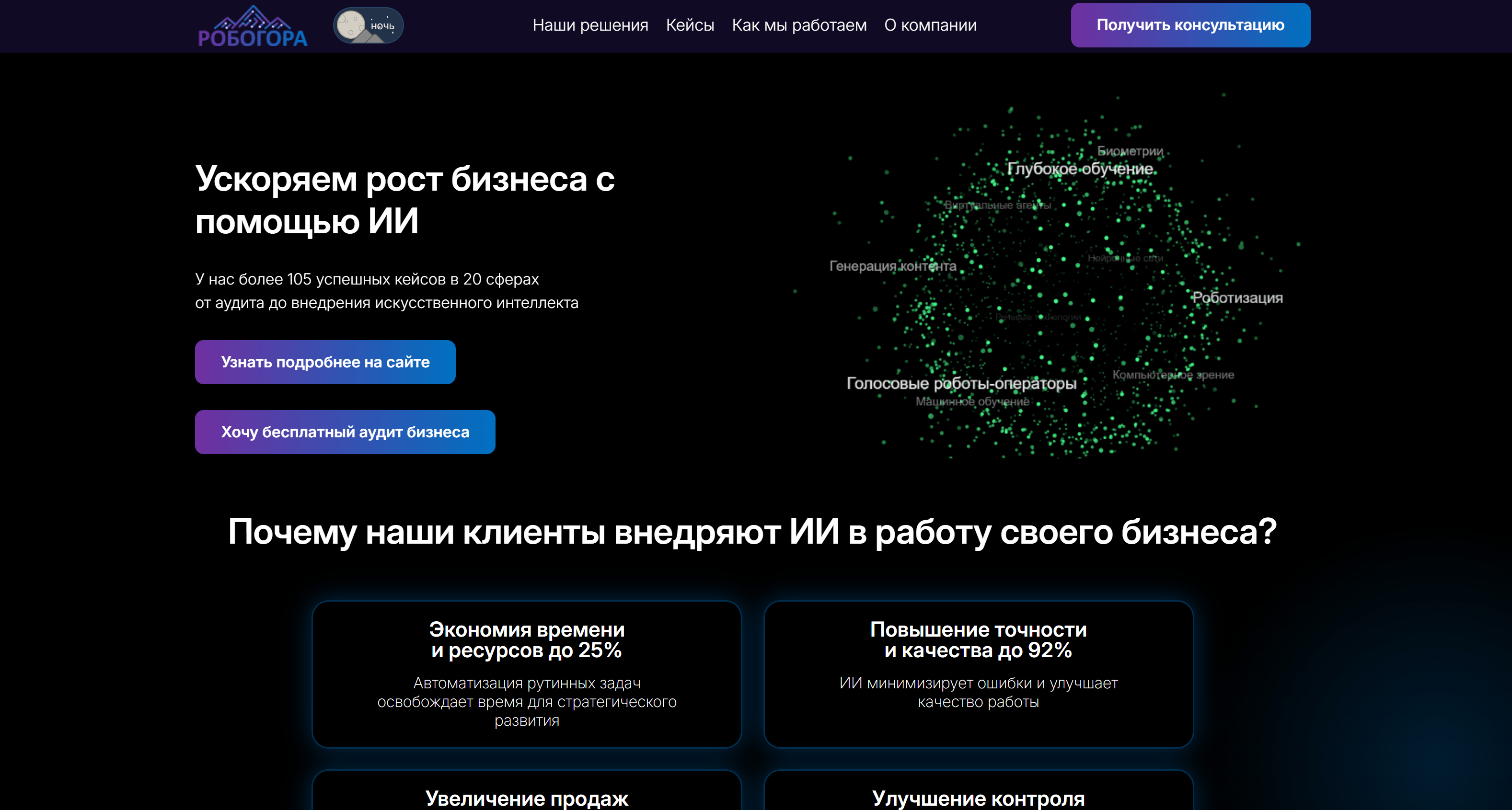 Спроектировать и запустить AI-портал Robogora — витрину компетенций и входную точку продаж. Портал должен показывать наши AI-проекты/решения по отраслям и задачам, быстро вести к заявке/созвону и доказывать премиальность за счёт методики, технологий и прозрачных KPI.