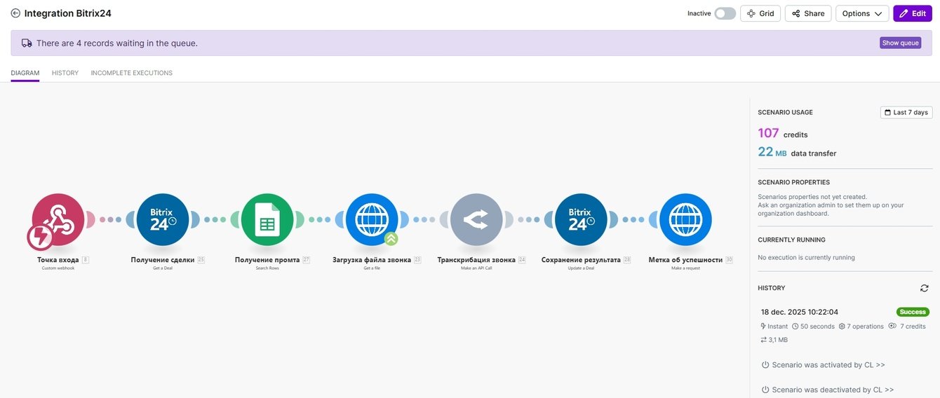 На стороне make.com разработан многошаговый сценарий для обработки веб-хука, чтения аудио-файла записи и AI-формализации текста звонка.