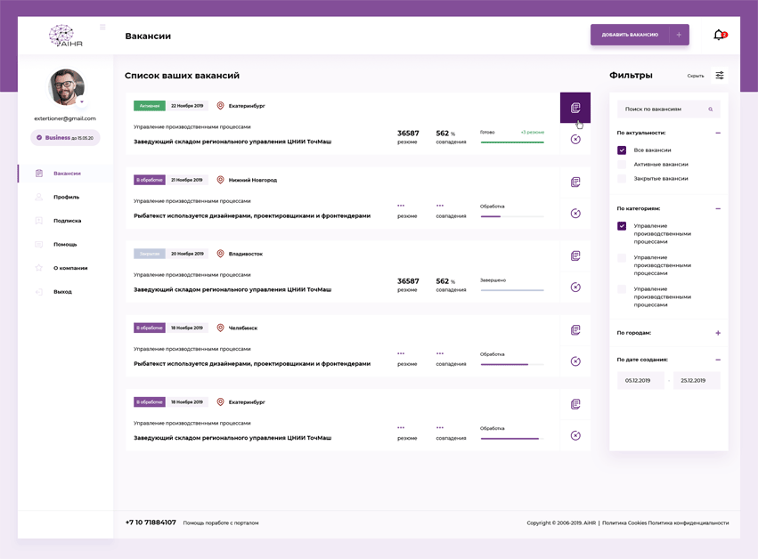 Мы создавали AIHR с расчетом на крупные компании, имеющие бизнес в нескольких городах. Для удобства использования, мы добавили фильтр поиска кандидатов по городам и вакансиям. Работодатель имеет возможность создавать несколько компаний в своем аккаунте, а также открывать и закрывать вакансии без повторного заполнения анкеты.