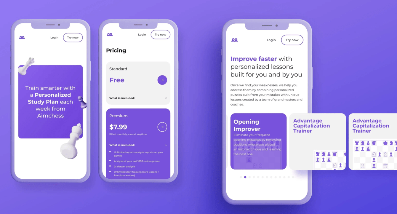 Дизайн и структура нового лендинга отталкиваются от особенностей сервиса. Для того чтобы выделить Aimchess на фоне конкурентов, необходимо было, прежде всего, показать не тематику продукта (шахматы), а его уникальный характер. В структуре требовалось сохранить простоту и интуитивность, чтобы не отвлекать пользователя от ценностного предложения компании.