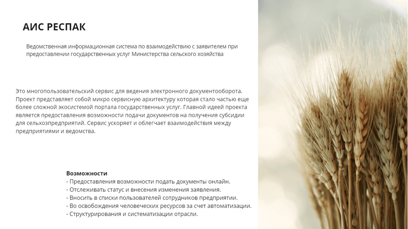 Главной идеей проекта является предоставления возможности подачи документов на получения субсидии предприятиями и ведомствами.