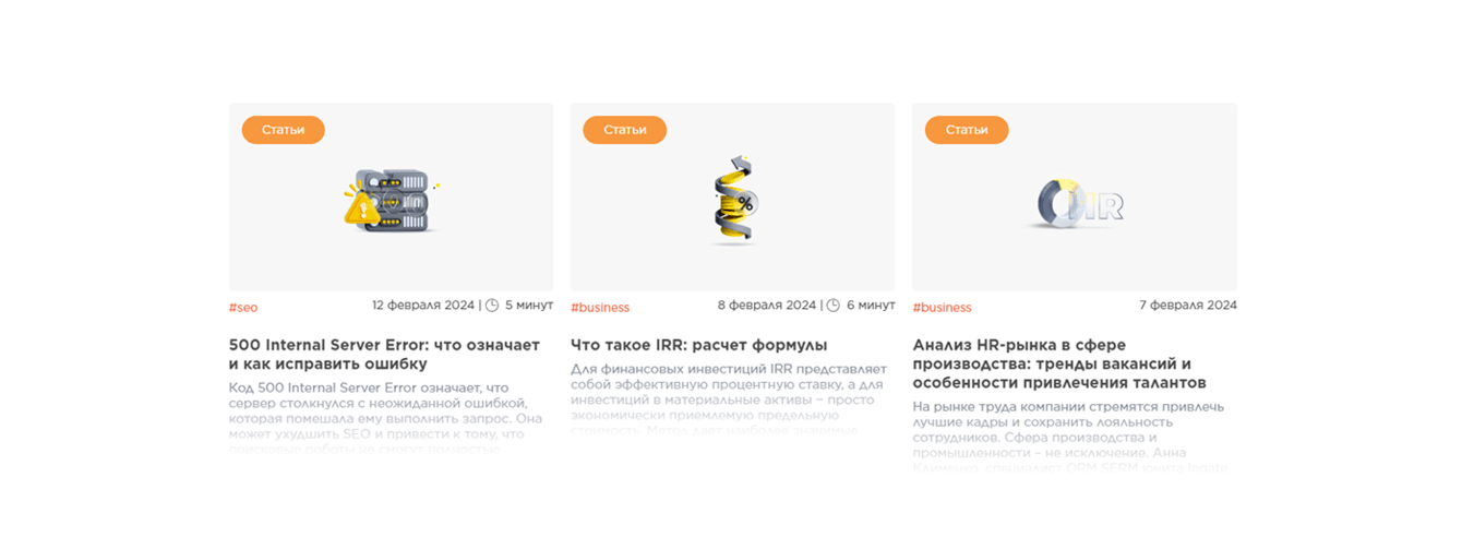 Для блога Ingate Group используются иконки в едином стиле в цветах бренда. Каждая иконка уникальна и отражает смысл статьи.