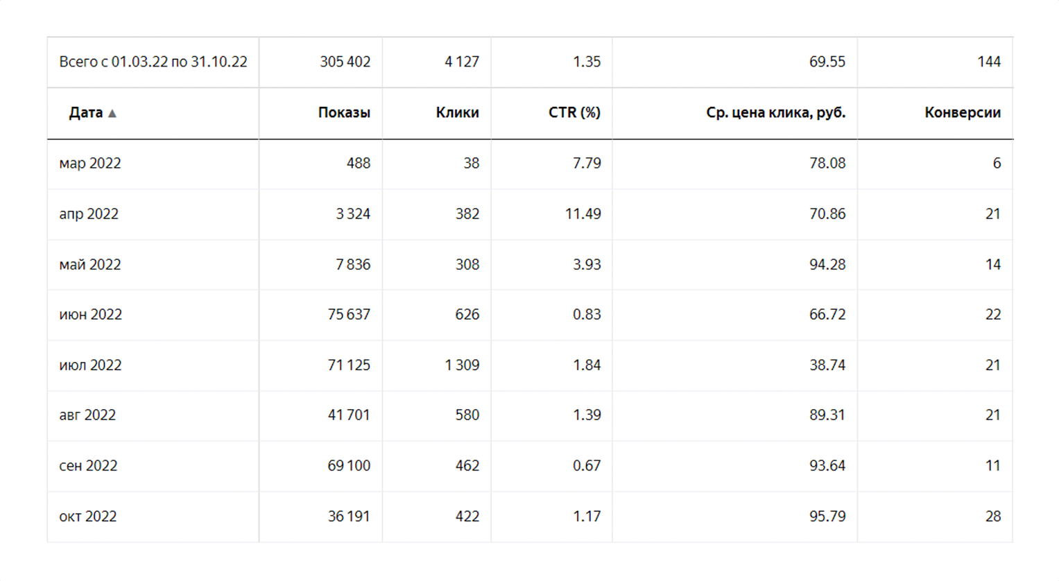 К концу сезона, в октябре, клиент сообщил о 729 заявках, включая все источники: обращения с сайта, звонки, письма. Из форм на сайте компания получила 144 заказа.