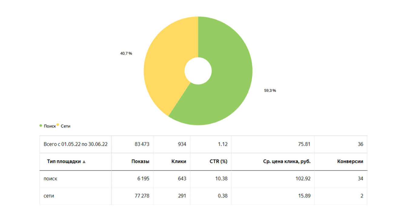 Скриншот: статистика по площадкам за первые два месяца работы кампаний на поиске и в РСЯ