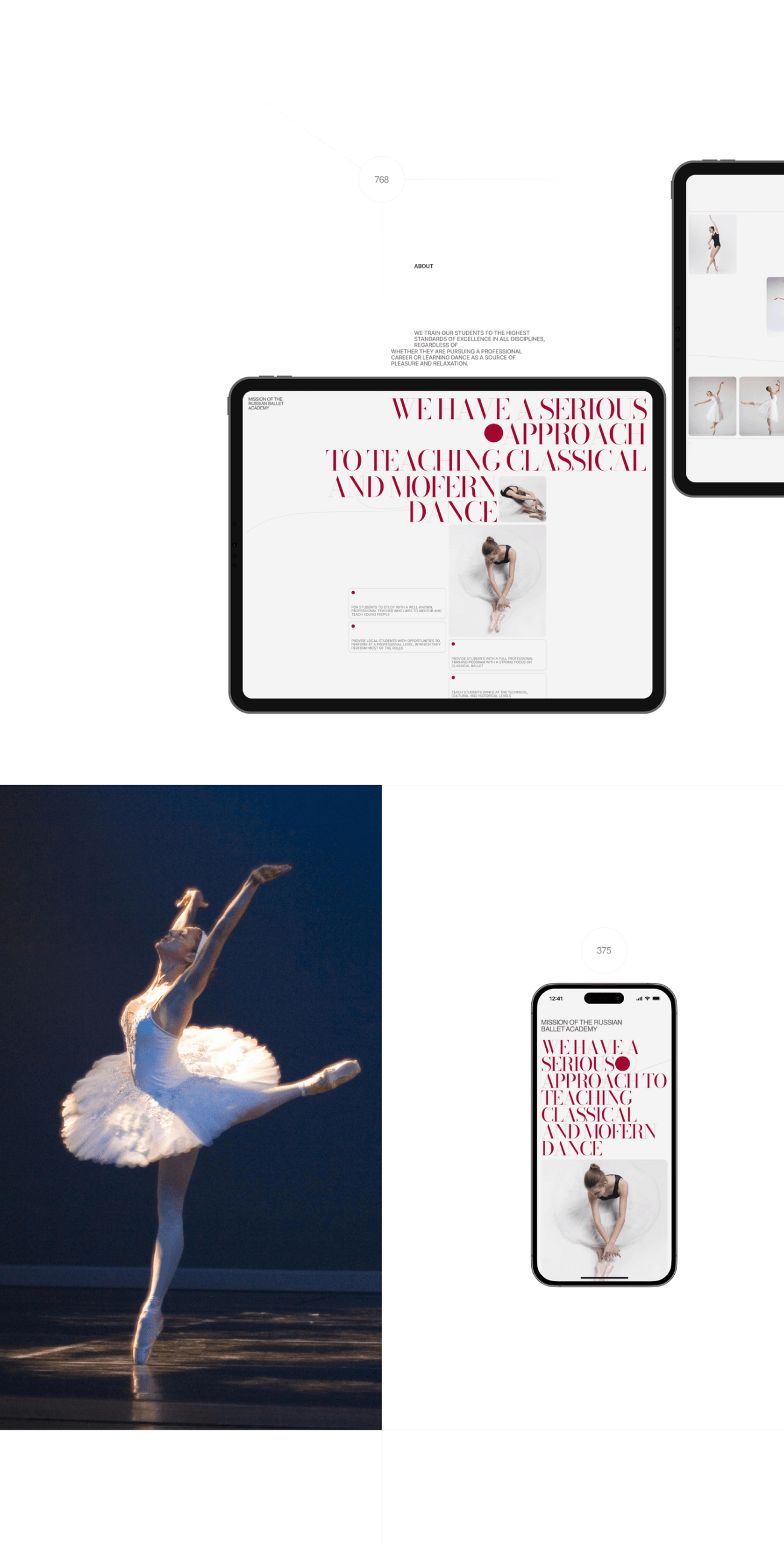 Балет это воздух, легкость, нежность и изящество. Мы хотели эти эмоции передать через сайт. Попробовали разные цветовые решения: бежевый, черный, даже-темно зеленый. Но в итоге остановились на белом - отсылка к цвету пачки балерин. Акцентным цветом взяли красный, как цвет кулис у большого театра.