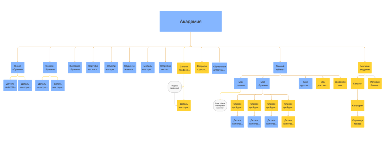 Начали с майндмапа, где наметили основные блоки сайта. В его основу легли CJM, юзабилити-аудит и коллы с заказчиком.