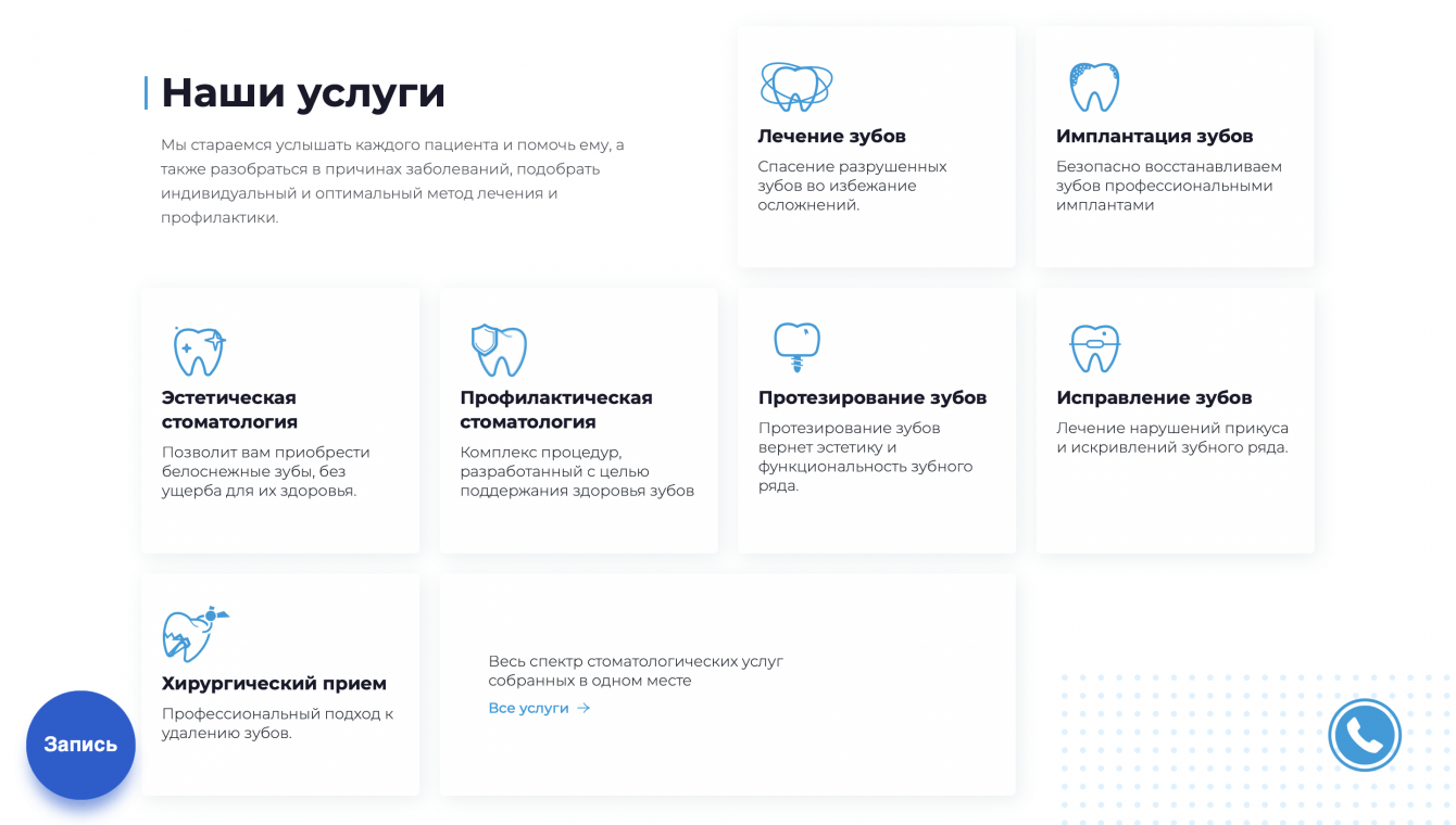 Перед нами стояла задача – показать компетенции заказчика в области стоматологии. Создать корпоративный сайт стоматологической клиники с учётом дальнейшего расширения услуг и проработать UX/UI интерфейса. Реализовать понятный и удобный каталог для быстрого поиска интересующих услуг. Подчеркнуть дизайном сайта стилистику и философию бренда.