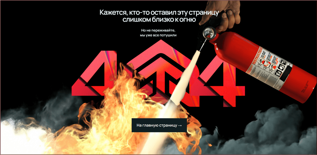 Дизайн страницы 404, выполненный в фирменном стиле компании, использует остроумный визуальный образ (например, тушение пожара), что делает страницу запоминающейся и снижает негативное впечатление от ошибки.