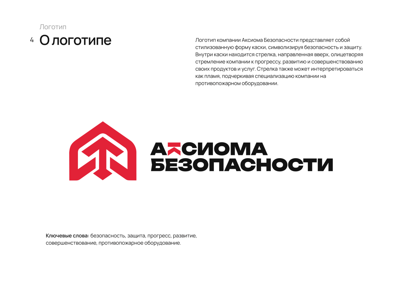 После обсуждения с клиентом был выбран финальный вариант логотипа — стилизованное изображение каски со стрелкой, направленной вверх. Каска символизирует защиту и безопасность, а стрелка — стремление к развитию и инновациям, а также может интерпретироваться как пламя, подчеркивая специфику компании.