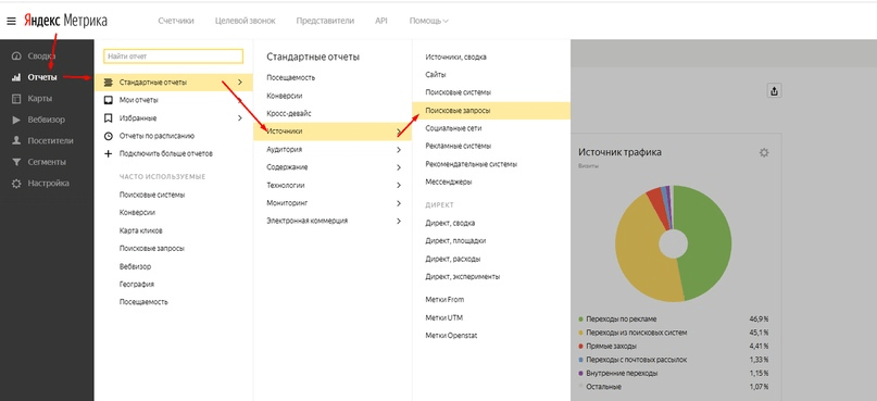 1. Зайти в раздел "Отчеты" - "Поисковые фразы" в интерфейсе Яндекс.Метрики.
