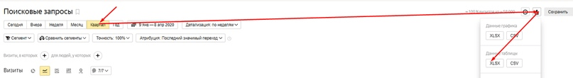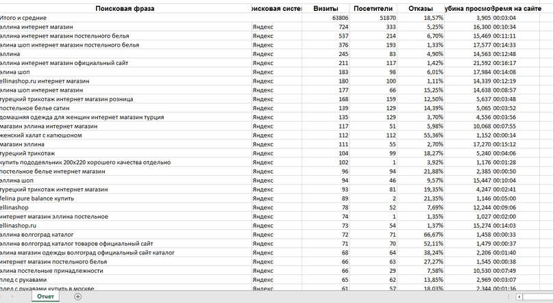 Полученный файл содержал список всех поисковых запросов, по которым сайт получал трафик за последний квартал, а также количество визитов и отказов по каждому запросу.