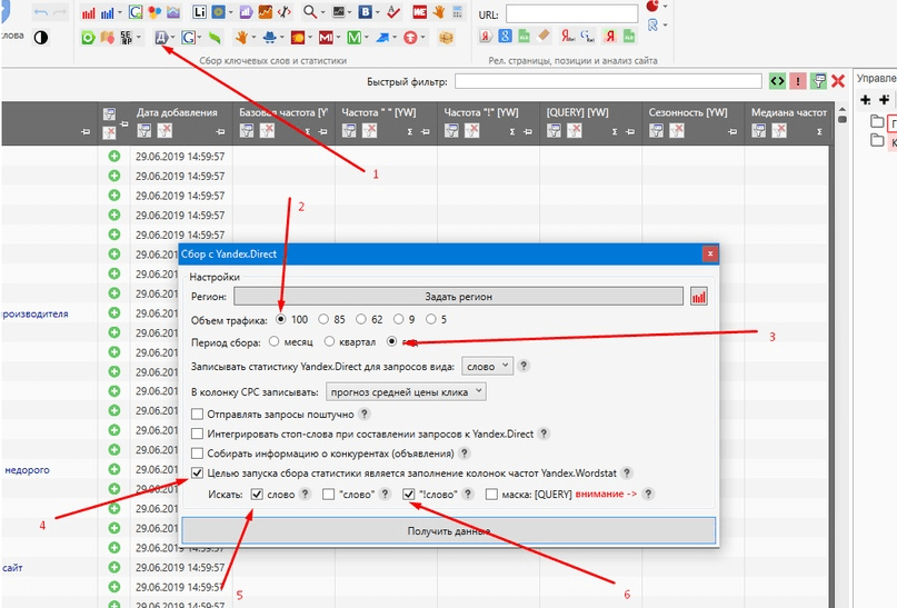 -Запуск парсинга частотности путем нажатия на кнопку "Получить данные с Яндекс.Директ".