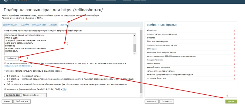 -Переход во вкладку "Списки" и добавление всех ранее собранных ключевых фраз.